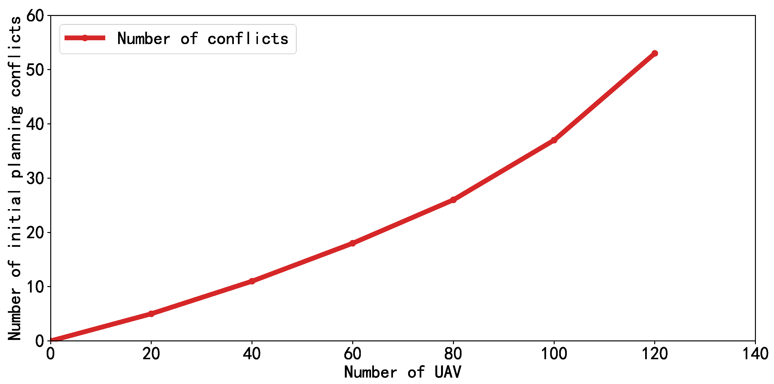 Figure 10. Small-scale UAVs exhibit almost no path conflicts, making conflict resolution relatively easy to achieve. As the scale of UAVs increases, the number of initial path conflicts rises rapidly, leading to increased difficulty in conflict resolution. The binary constraint tree continuously expands, resulting in more iterations of replanning and ultimately prolonging the planning time for conflict resolution.
