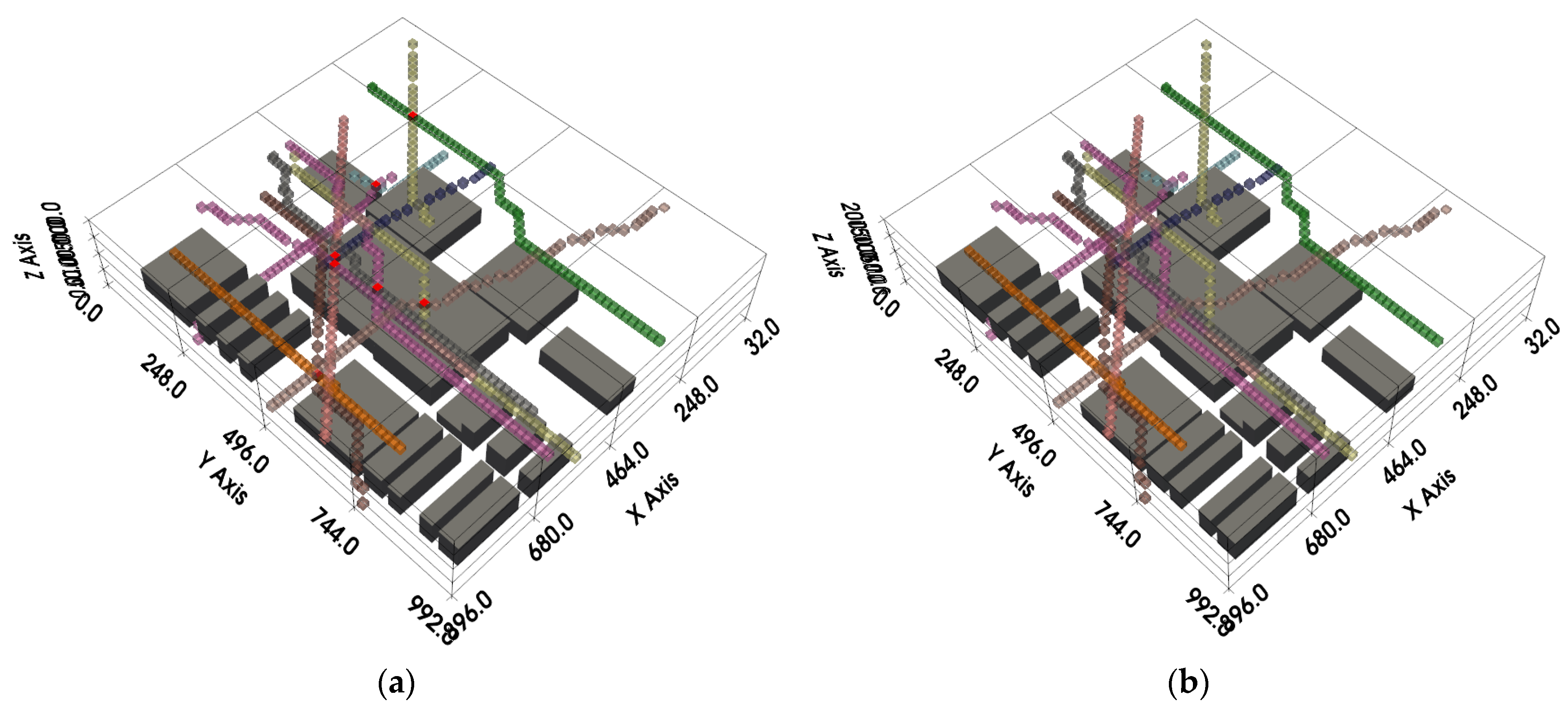 Figure 13a displays the conflicting flight paths in a scenario involving 120 drones, visualized using Python. The flight paths are represented by semi-transparent grid nodes in different colors, with red nodes indicating conflict points. After conflict detection, path conflict resolution was performed to replan the paths of the conflicting drones. The results, presented in