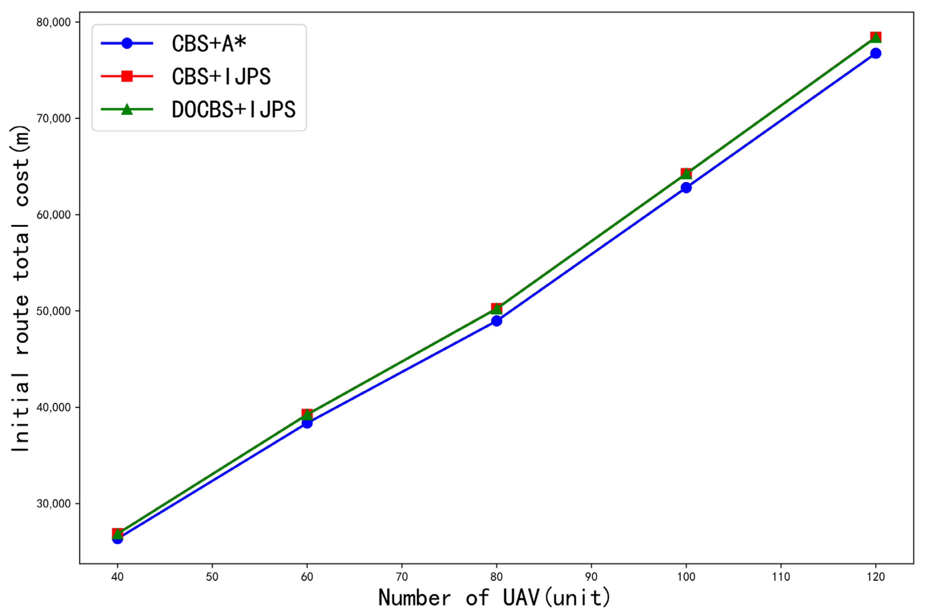 Figure 14, using the total path length as the metric for evaluating the optimality of conflict-free path solutions, it can be concluded that the CBS + A* method achieves the best optimality, slightly outperforming both the CBS + IJPS and DOCBS + IJPS methods. This is primarily because the A* algorithm generally exhibits slightly better optimality than the JPS algorithm in large-scale maps. Using the total path length of the conventional CBS + A* algorithm as a baseline, the total path length planned by the DOCBS + IJPS algorithm is approximately 2.5% (calculated from the data in