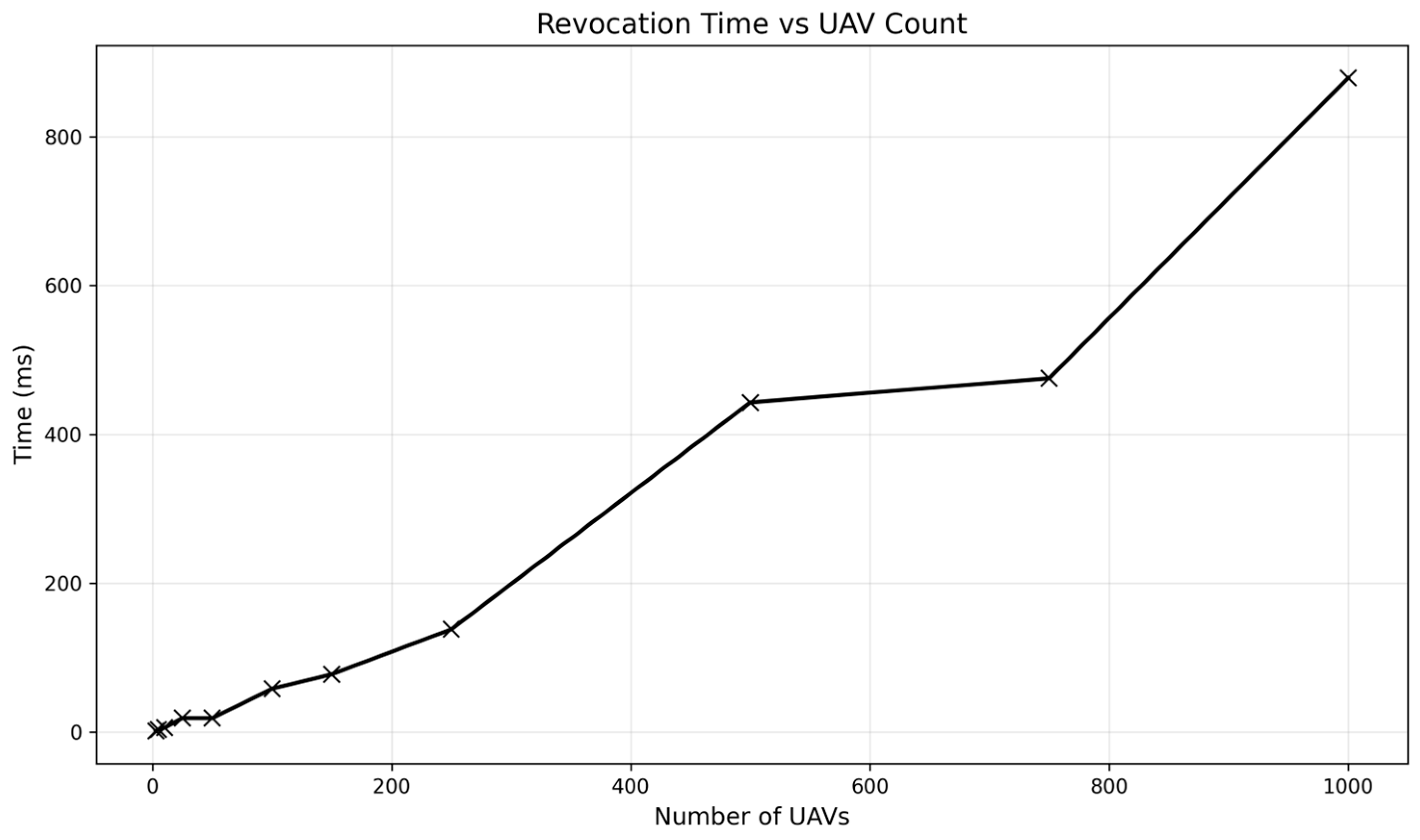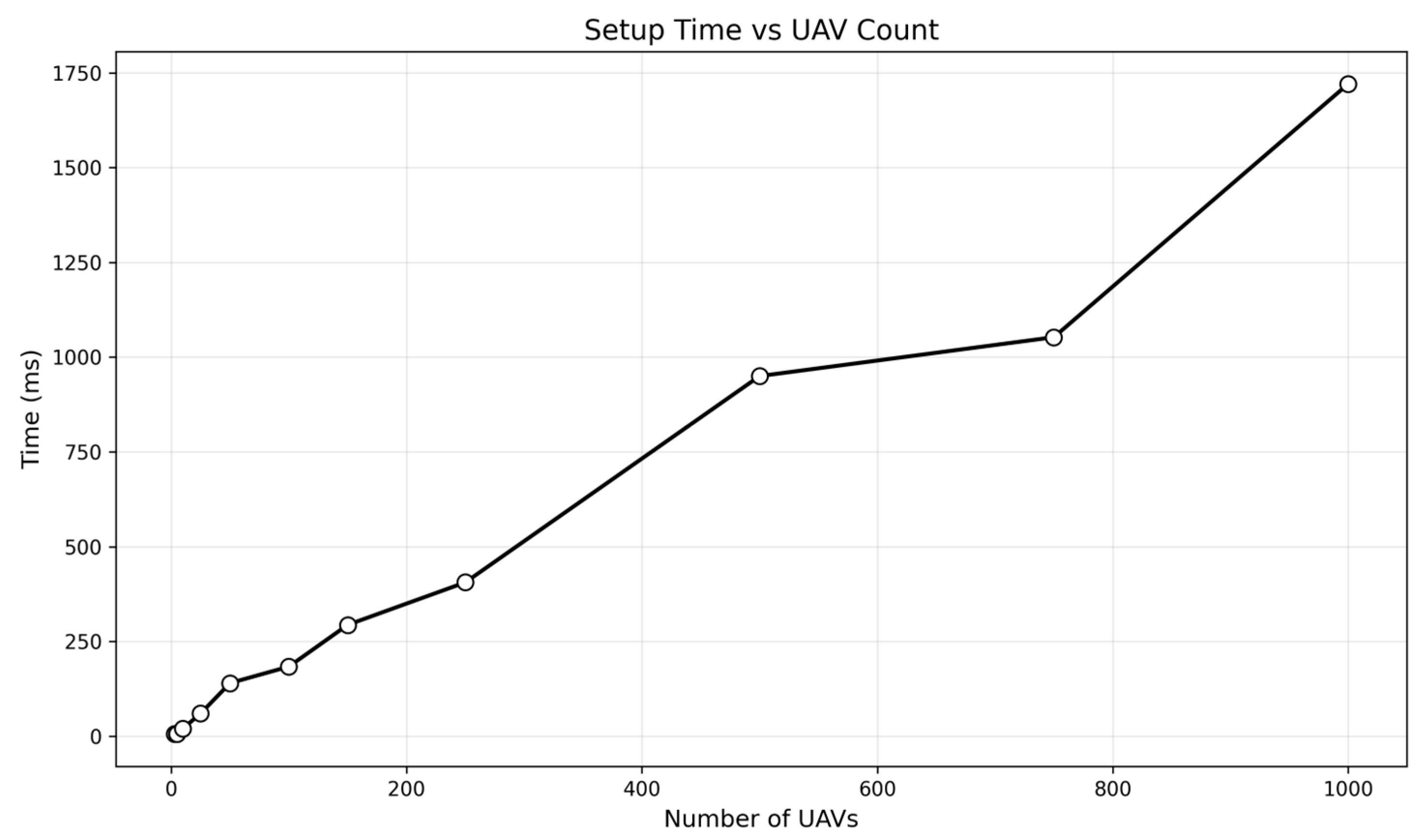 UAV Count | Setup (ms) | Sign (ms) | Verify (ms) | Revocation (ms) | Memory/UAV (KB) | Total Memory (MB) |