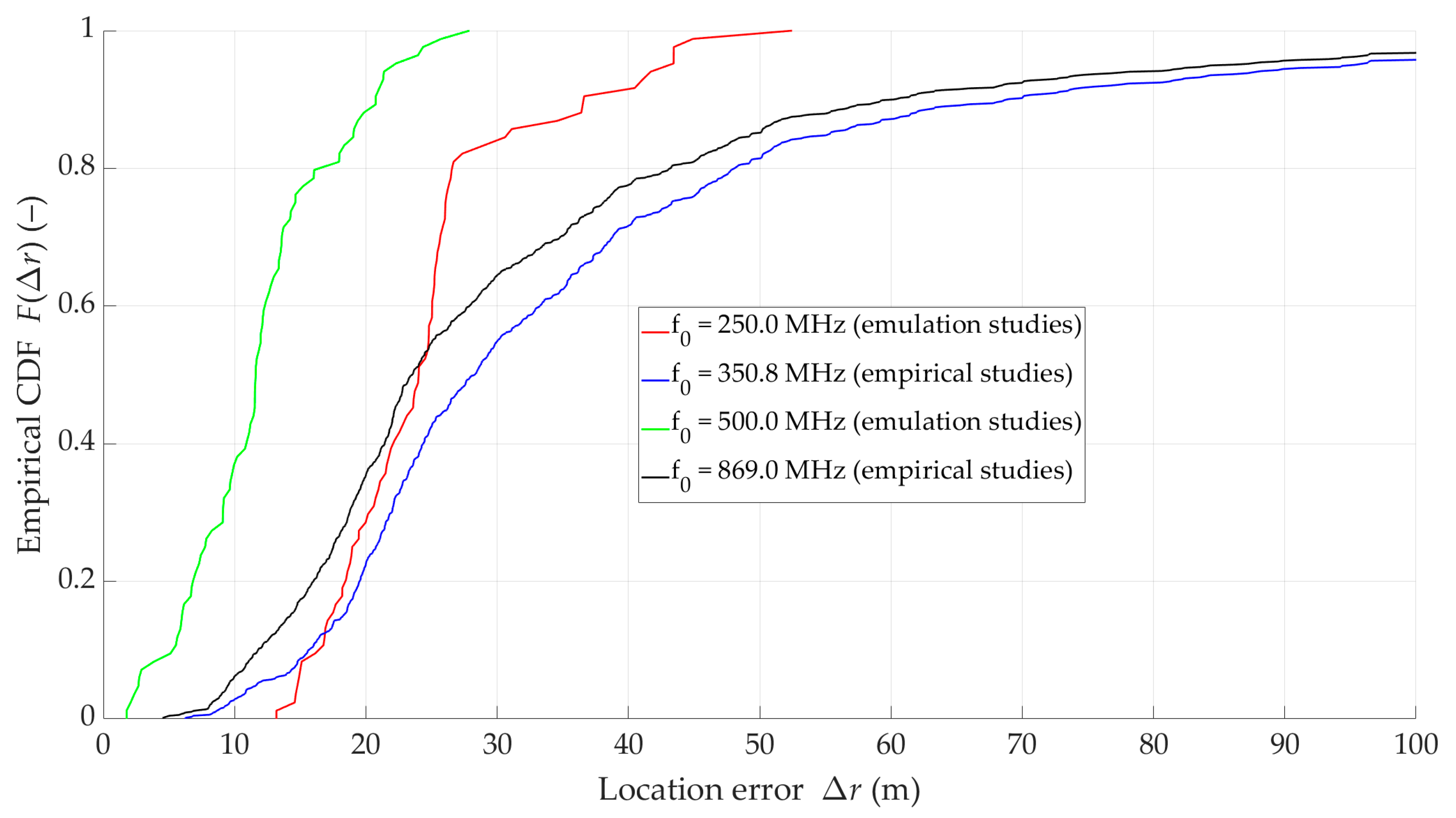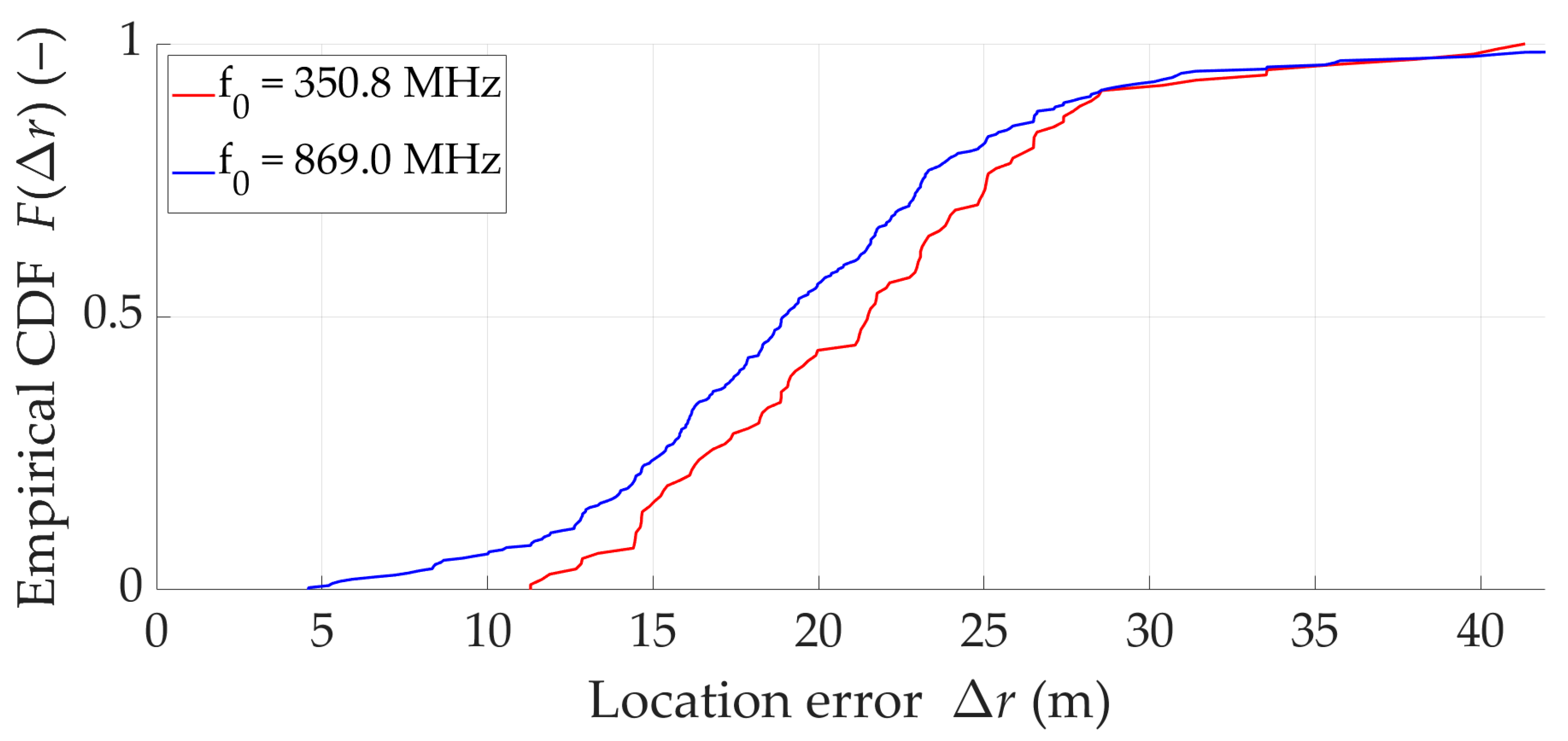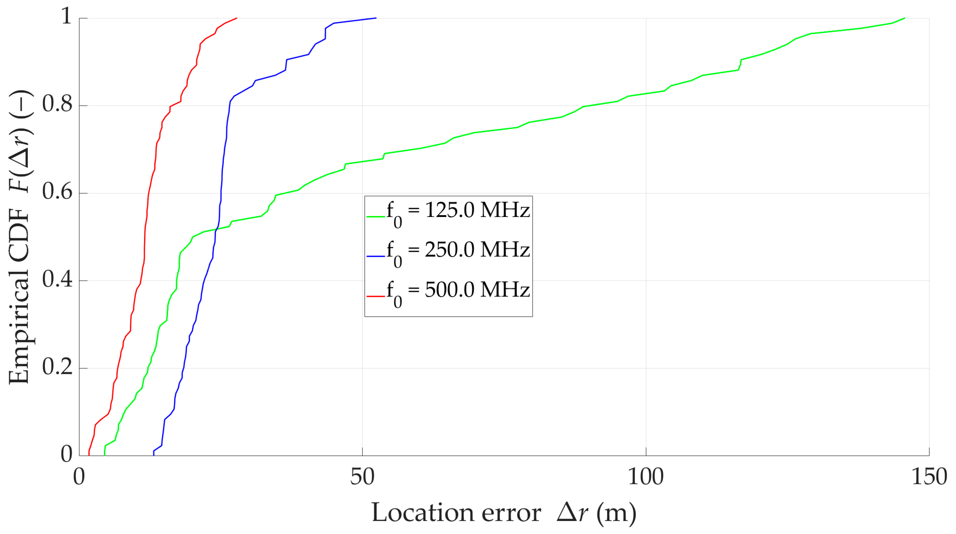 Tested Carrier Frequency (MHz) | Location Error (m) | |||