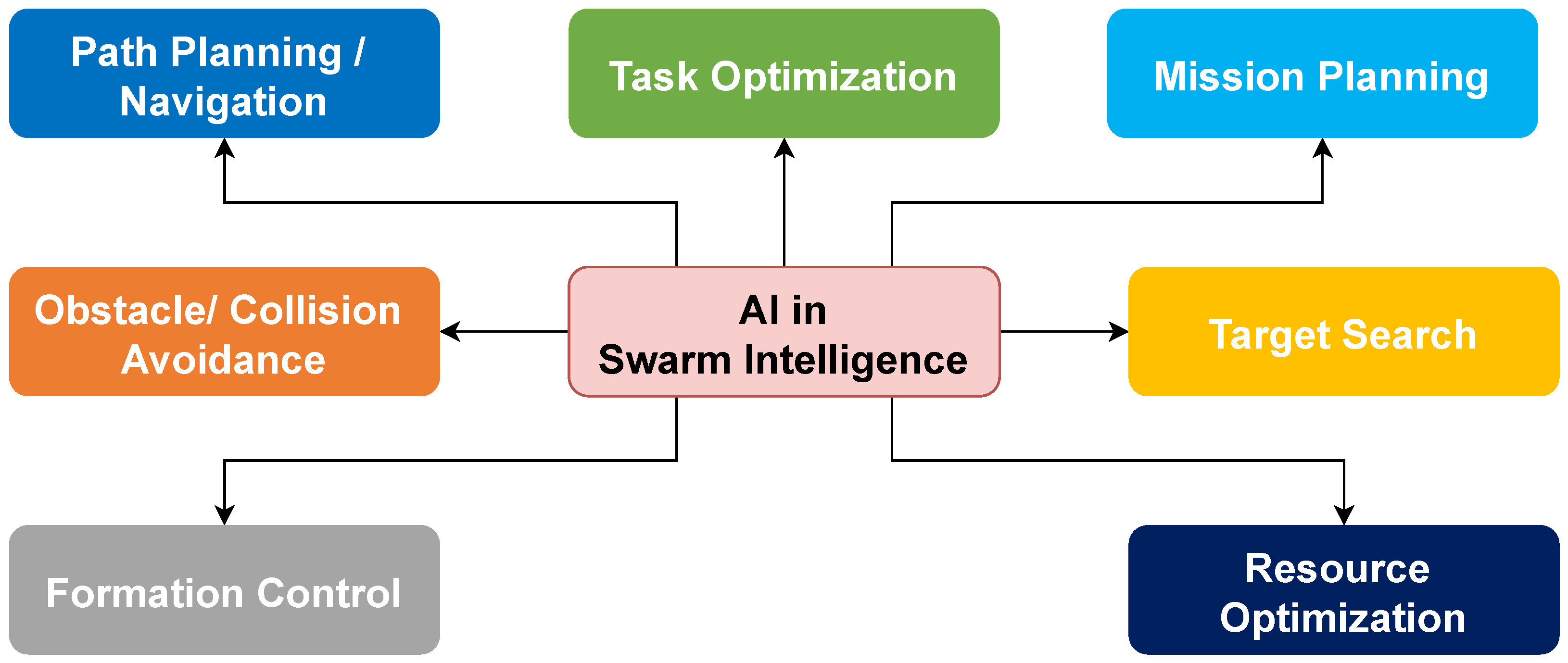 - AI in Swarm Intelligence: Applications of AI to swarm coordination, path planning, resource allocation, target tracking, formation control, and other collective swarm behaviors.