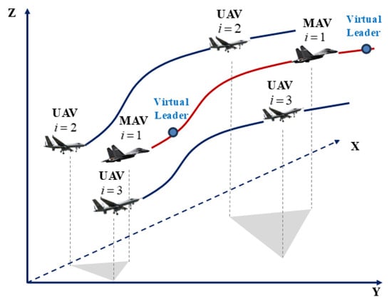 Given a virtual leader, when the position of the MAV converges to the reference value relative to it, and each UAV’s position also converges to the corresponding reference value relative to the MAV, the desired formation geometry is established. As illustrated in Figure 1, we define the formation tracking problem as