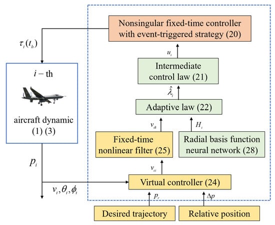This section is devoted to developing an event-triggered fixed-time formation tracking control machine for the purpose of guaranteeing fixed-time formation tracking under modeling uncertainties and external disturbances. The proposed control frame-work is shown in Figure 2.