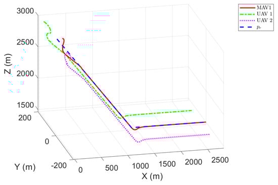 The task is set as a humanitarian mission, where the virtual leader provides the trajectory reference. Given the formation scenario involving a manned aerial vehicle (MAV) and two unmanned aerial vehicles (UAVs), the MAV is tasked with tracking the predetermined trajectory. During this process, the MAV issues specific operation tasks to the UAVs. Each UAV follows the MAV’s trajectory precisely, thereby forming a designated formation.