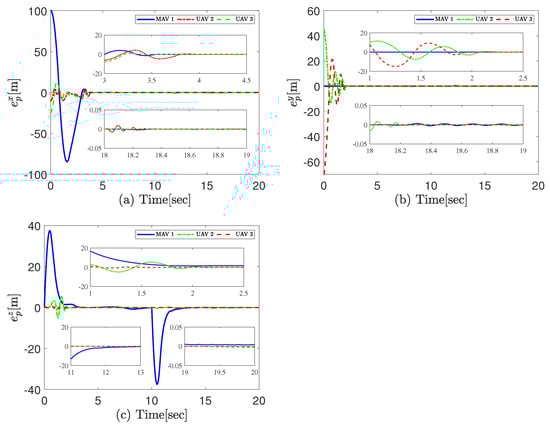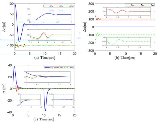 Response curves of relative positions for MAV/UAVs. (a) x-direction relative distances. (b) y-direction relative distances. (c) z-direction relative distances.