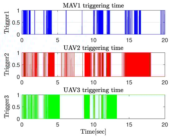 In actual flight control systems, limited computing and communication resources are a common challenge. Traditional formation cooperative control typically employs periodic sampling, which involves taking system state samples and updating control instructions at fixed intervals. However, this continuous high-frequency sampling and communication can lead to significant computational resource consumption and unnecessary actuator wear and tear []. Event-triggered control, on the other hand, dynamically triggers sampling and controller updates based on state errors or preset thresholds, effectively reducing the load on computational and communication resources [,,]. To date, two primary event-triggered adaptive controller design strategies have been developed: the fixed threshold strategy [,] and the relative threshold strategy [,]. The fixed threshold strategy determines the event triggering condition using a predetermined value, irrespective of the system’s current state. In contrast, the relative threshold strategy bases its event triggering condition on an expression linked to the control signal. This means that when the system control signal is strong, the event triggering condition is heightened. Conversely, when the control signal is weak, a fixed value in the expression prevents the Zeno phenomenon from occurring [,]. However, when the control signal is too strong, it can result in excessive control errors. Therefore, combining these two strategies to design a switching threshold strategy for MAV/UAVs is crucial for maintaining a balance between event triggering intervals and system performance.