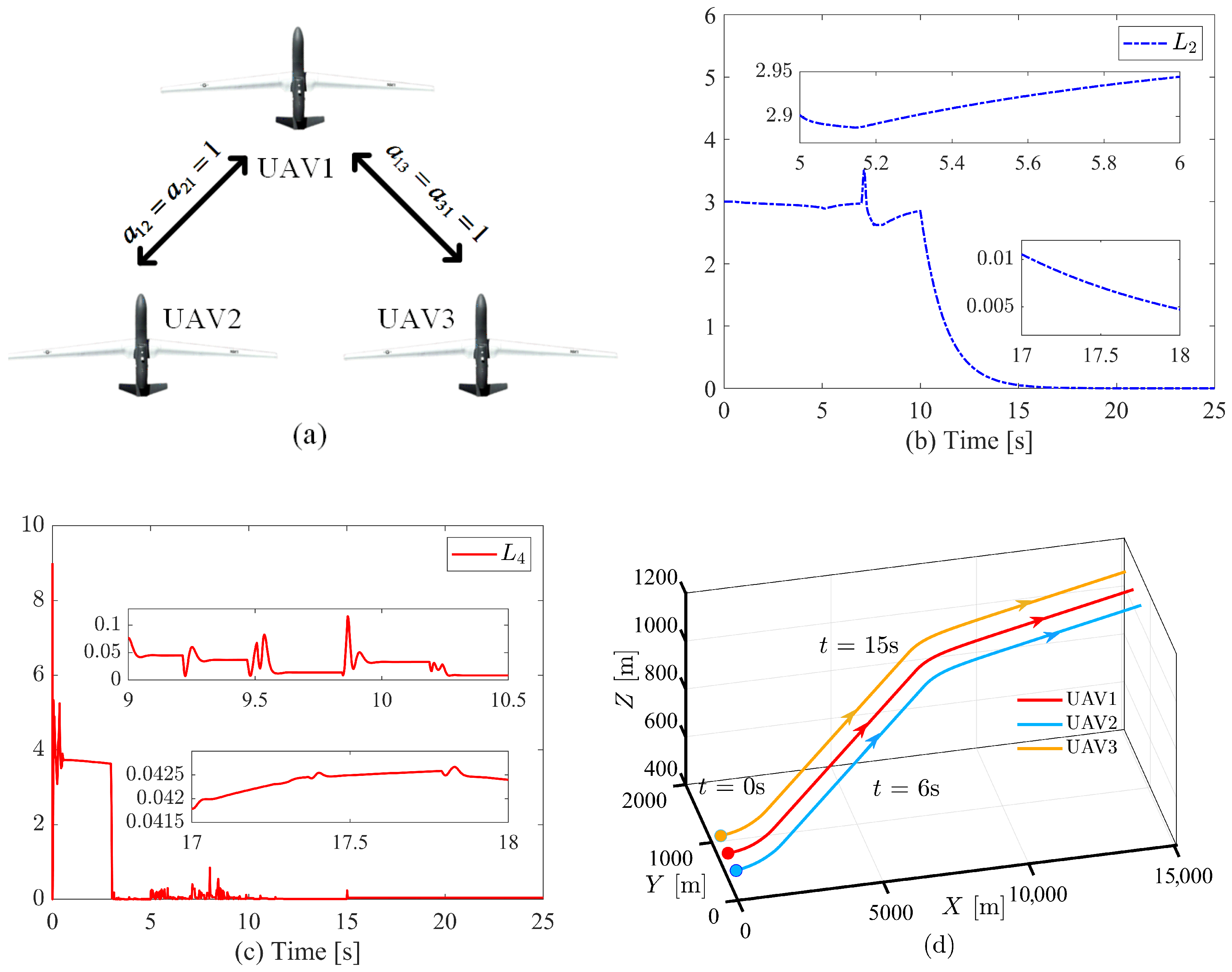 - The designed Dynamic Self-Triggered Mechanism (DSTM) strictly excludes Zeno behavior, ensuring a positive minimum inter-event time. Moreover, it eliminates the necessity for continuous monitoring of neighboring UAVs’ states, thereby significantly reducing both communication bandwidth usage and onboard computational resource consumption.