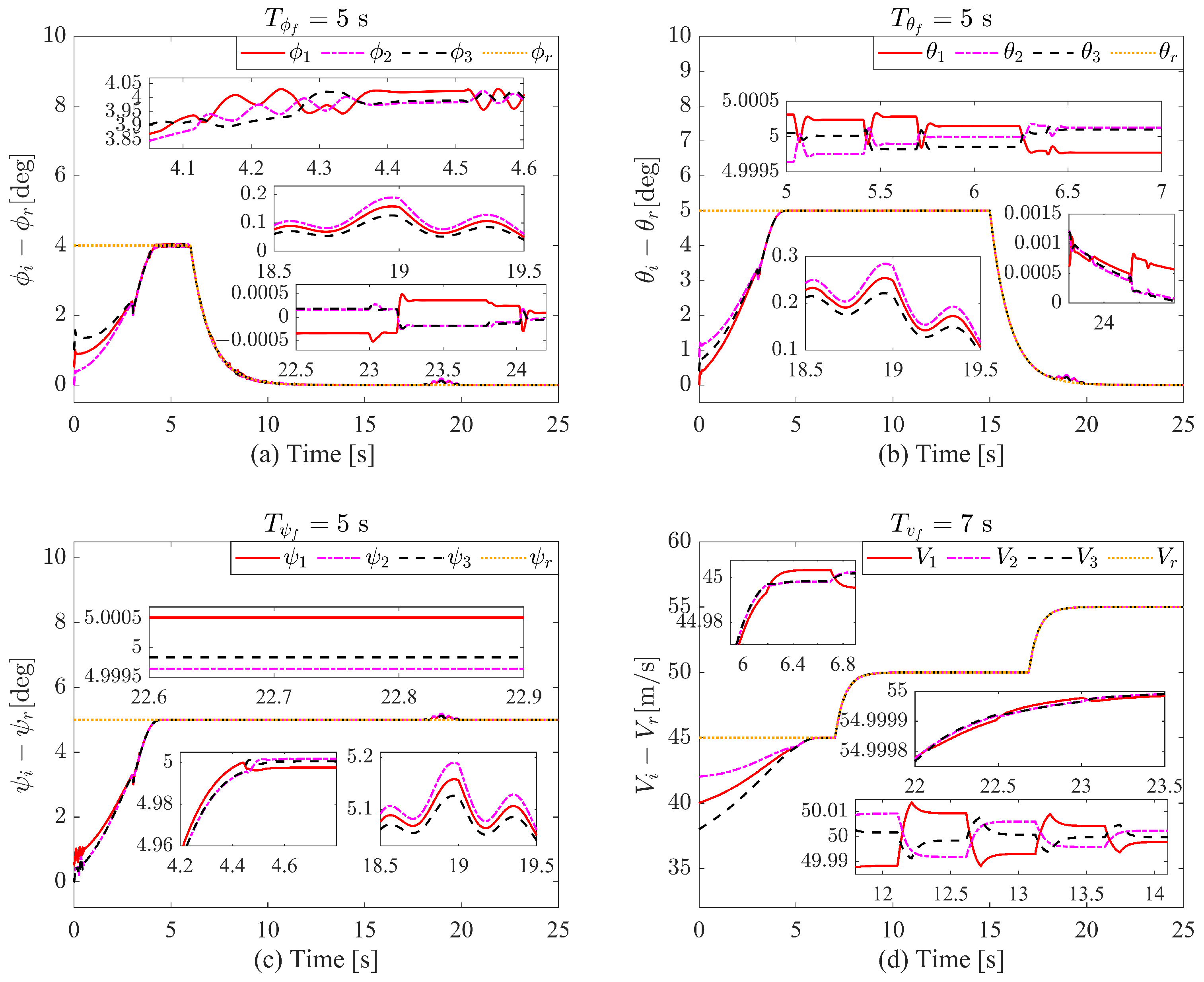 - All closed-loop signals of the multi-UAV formation system are guaranteed to be Semi-Globally Uniformly Ultimately Bounded (SGUUB). Furthermore, both the velocity tracking error and the attitude tracking error converge to compact sets around the origin within a predefined settling time T, which is independent of initial conditions.