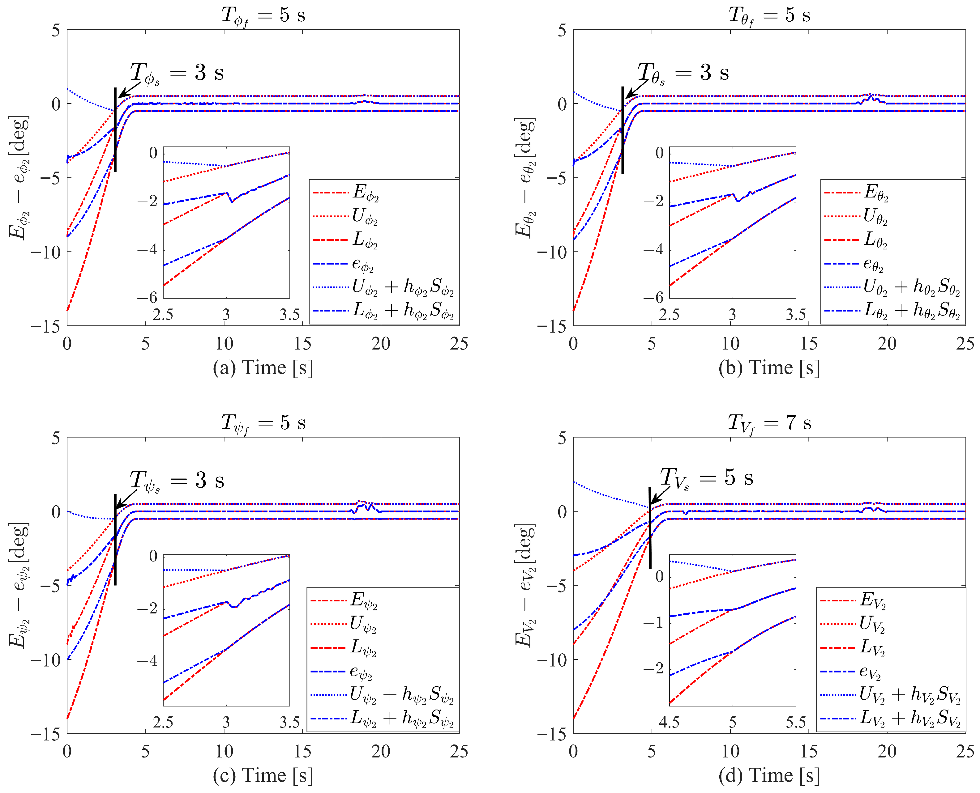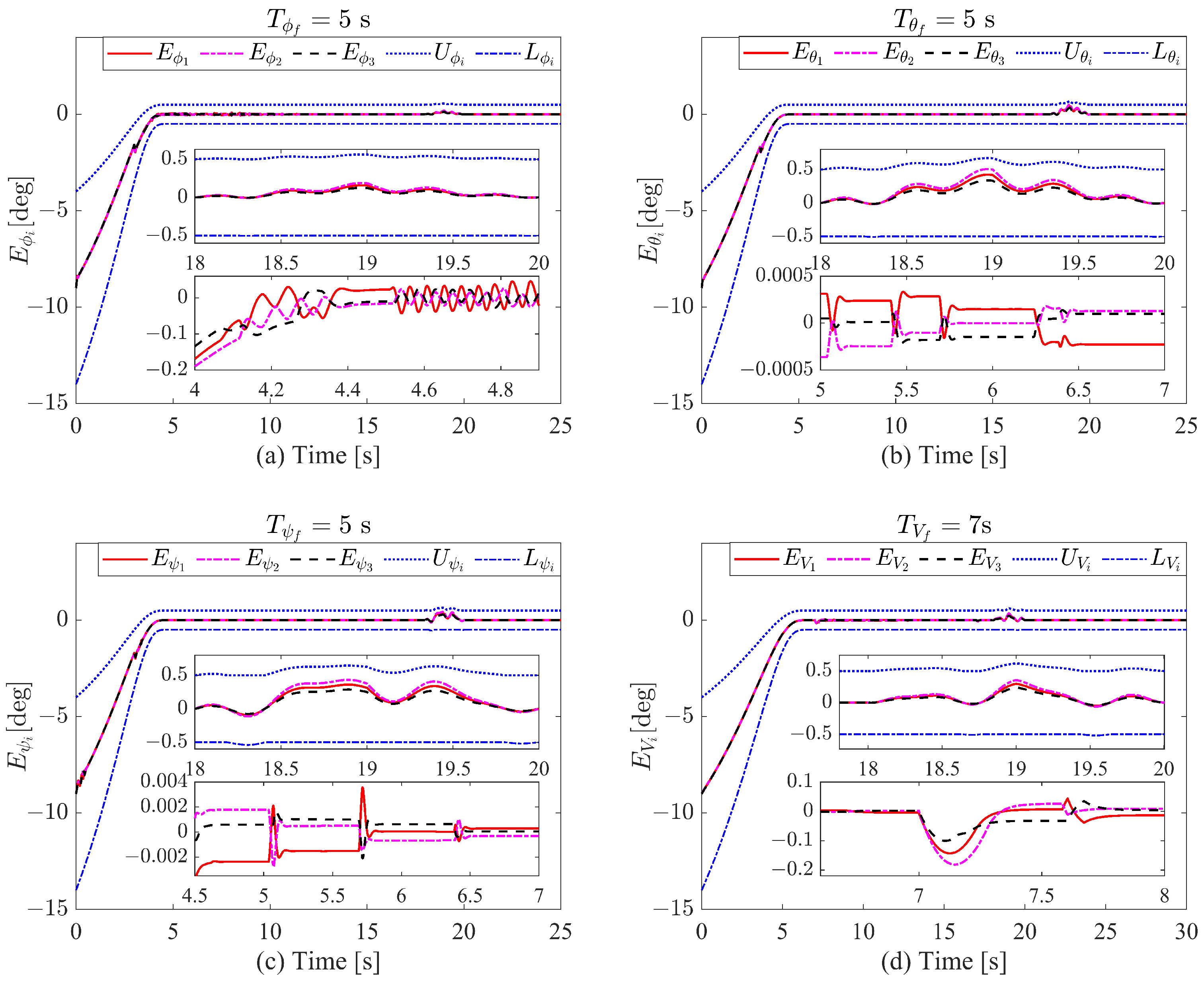 - The transformed tracking errors are guaranteed to remain strictly within the envelopes defined by the self-adjusting boundary performance functions throughout the entire operation. Specifically, the velocity error is constrained by and the attitude errors are constrained by .