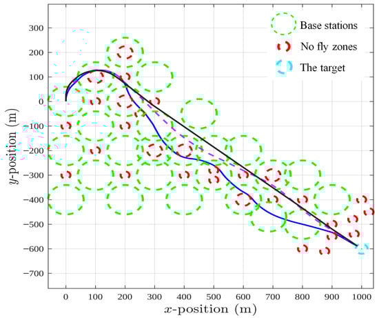 The blue dash-dotted trajectory belongs to the case and . Here the optimization strongly favors the second objective, so the UAV deliberately takes detours to remain in coverage rather than rushing straight to the goal. The pink dashed trajectory, obtained with and , is more balanced. It reflects a compromise: the UAV still makes an effort to stay connected, but it also tries not to stray too far from a direct route. Finally, the black solid trajectory corresponds to and . In this case, the UAV clearly “ignores” the communication aspect and heads almost straight toward the target, even if that means spending time outside base station coverage.