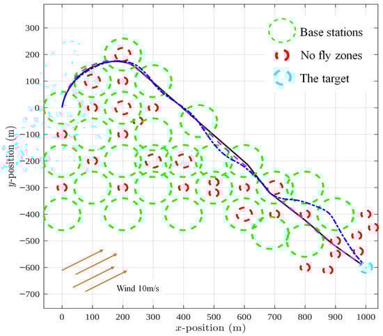 The blue dash-dotted trajectory corresponds to the case and . Here, as in the no-wind scenario, the UAV strongly favors the second objective and adjusts its route to stay connected, but the presence of wind forces additional deviations from a straight line. The pink dashed trajectory, obtained with and , again represents a compromise. The UAV tries to balance directness with connectivity, but wind drift makes this balance more challenging, resulting in a route that is less smooth than in still-air conditions. Finally, the black solid trajectory with and reflects a near-exclusive focus on reaching the target quickly. The UAV essentially flies straight toward the goal, but the wind pushes it sideways, producing noticeable offsets along the way.