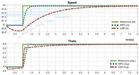 Figure 4, the difference between the MPC and LQR controllers becomes evident when a step reference is applied to both channels at the first second of the simulation. In the velocity channel, the MPC controller tracks the reference smoothly, reaching the target in only