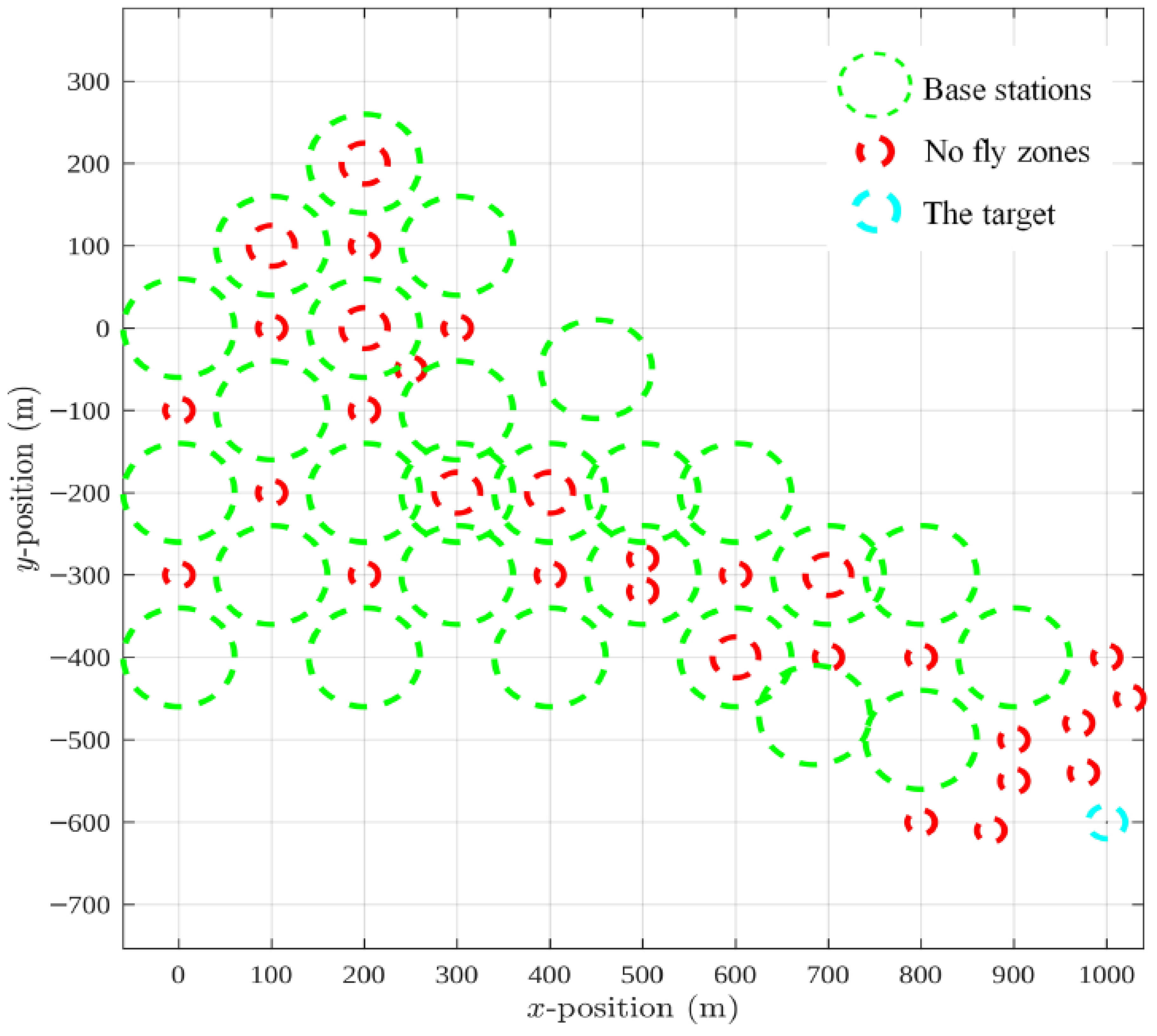 y-axis. Within this space, 26 base stations (green circles) and 30 no-fly zones (red circles) are distributed. Each base station provides coverage over a circular region with a diameter of 120 m, located at a common altitude and offering identical signal strength. No-fly zones are modeled as circular regions with a diameter of 30 m. To reflect stricter safety regulations, the diameter of a no-fly zone is increased to 50 m if it falls within the coverage area of a base station. The overall simulation environment is illustrated in