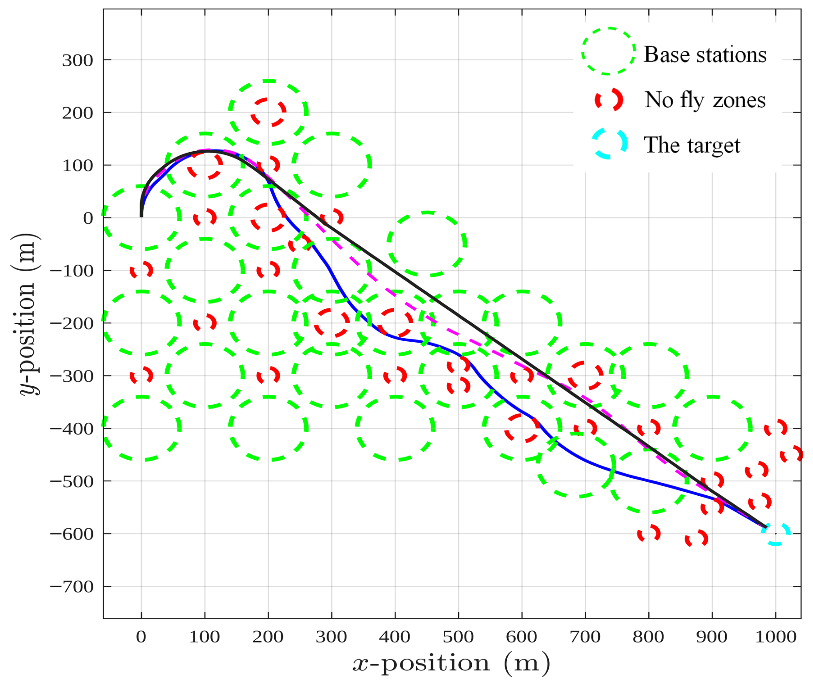 The blue dash-dotted trajectory belongs to the case and . Here the optimization strongly favors the second objective, so the UAV deliberately takes detours to remain in coverage rather than rushing straight to the goal. The pink dashed trajectory, obtained with and , is more balanced. It reflects a compromise: the UAV still makes an effort to stay connected, but it also tries not to stray too far from a direct route. Finally, the black solid trajectory corresponds to and . In this case, the UAV clearly “ignores” the communication aspect and heads almost straight toward the target, even if that means spending time outside base station coverage.
