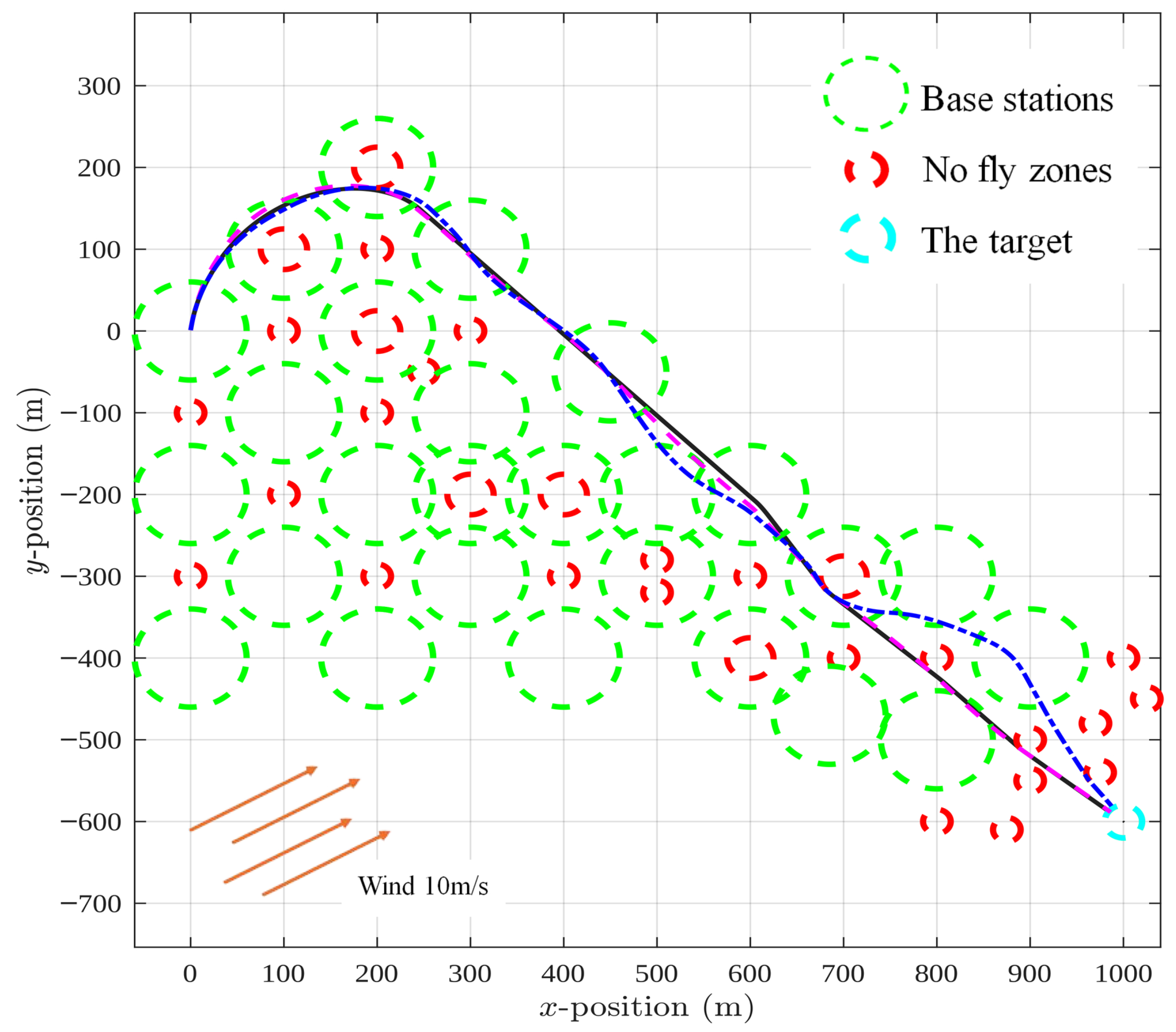 The blue dash-dotted trajectory corresponds to the case and . Here, as in the no-wind scenario, the UAV strongly favors the second objective and adjusts its route to stay connected, but the presence of wind forces additional deviations from a straight line. The pink dashed trajectory, obtained with and , again represents a compromise. The UAV tries to balance directness with connectivity, but wind drift makes this balance more challenging, resulting in a route that is less smooth than in still-air conditions. Finally, the black solid trajectory with and reflects a near-exclusive focus on reaching the target quickly. The UAV essentially flies straight toward the goal, but the wind pushes it sideways, producing noticeable offsets along the way.