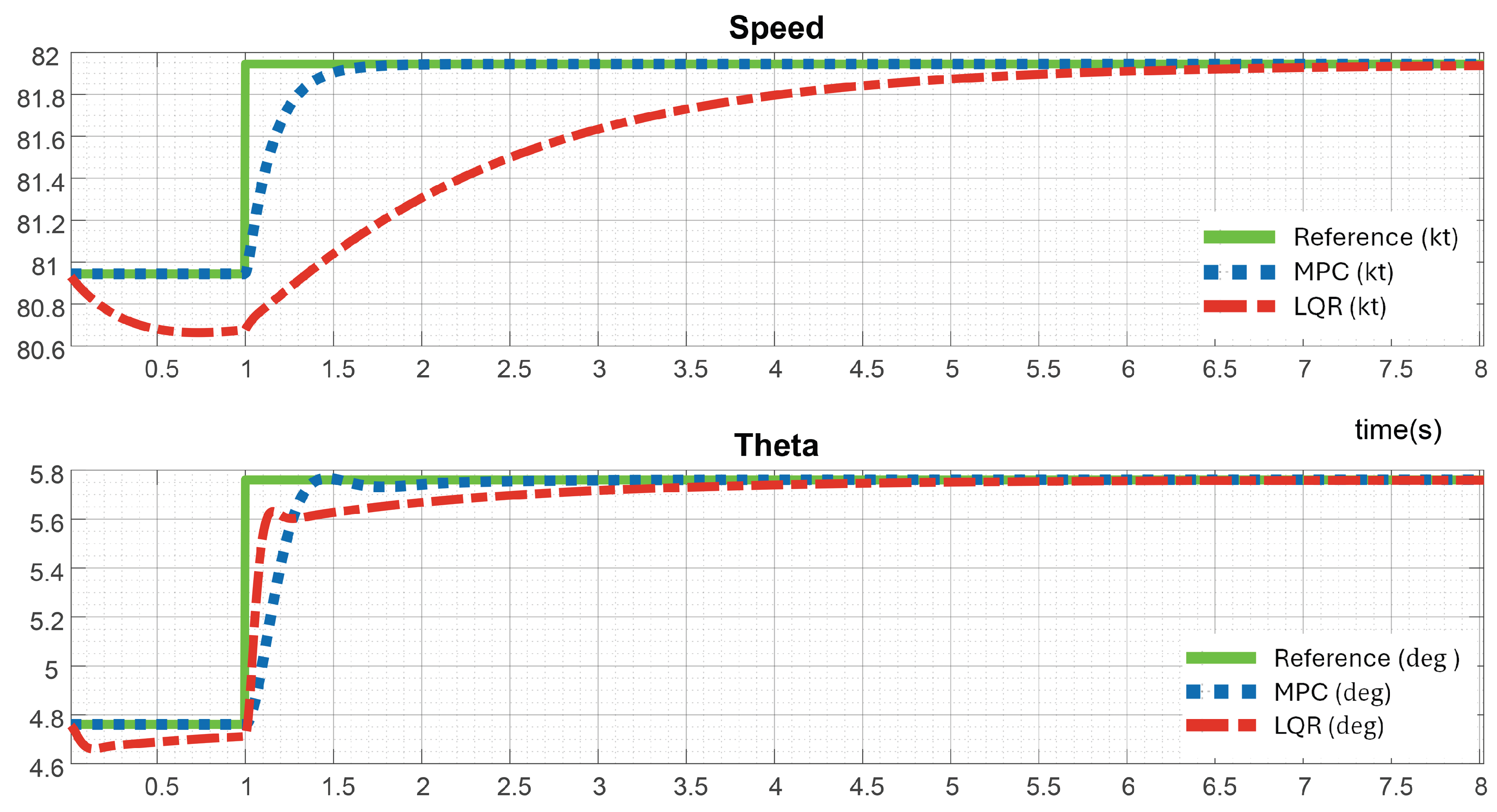 Figure 4, the difference between the MPC and LQR controllers becomes evident when a step reference is applied to both channels at the first second of the simulation. In the velocity channel, the MPC controller tracks the reference smoothly, reaching the target in only