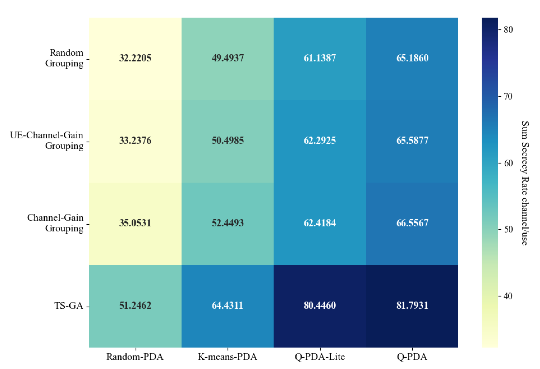 Among Q-PDA and the benchmark position decision algorithms, all the grouping algorithms have higher performance with the combination of Q-PDA. This is because Q-PDA arranges drones in areas with dense UEs while keeping them far from Eves. This deployment enhances the received SINR of UEs and reduces the probability of signal interception by Eves, thereby improving the overall system security performance.