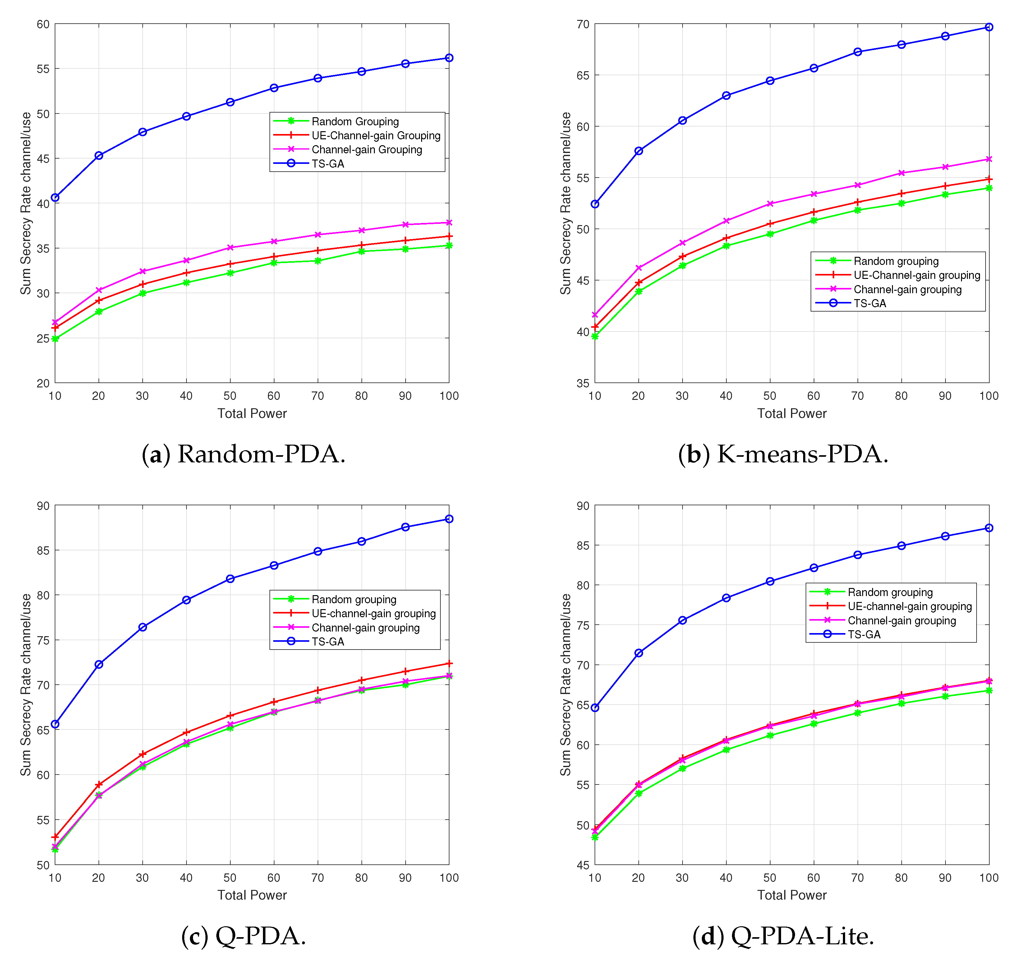 Figure 6c, when the channel-gain-grouping is employed instead of TS-GA, the performance improves slightly relative to random-grouping and UE-channel-gain-grouping but still cannot match TS-GA. This is because the channel-gain-grouping only prioritizes the “UE–drone–Eve distance” metric, while TS-GA explores multiple dimensions to generate more optimal groupings.
