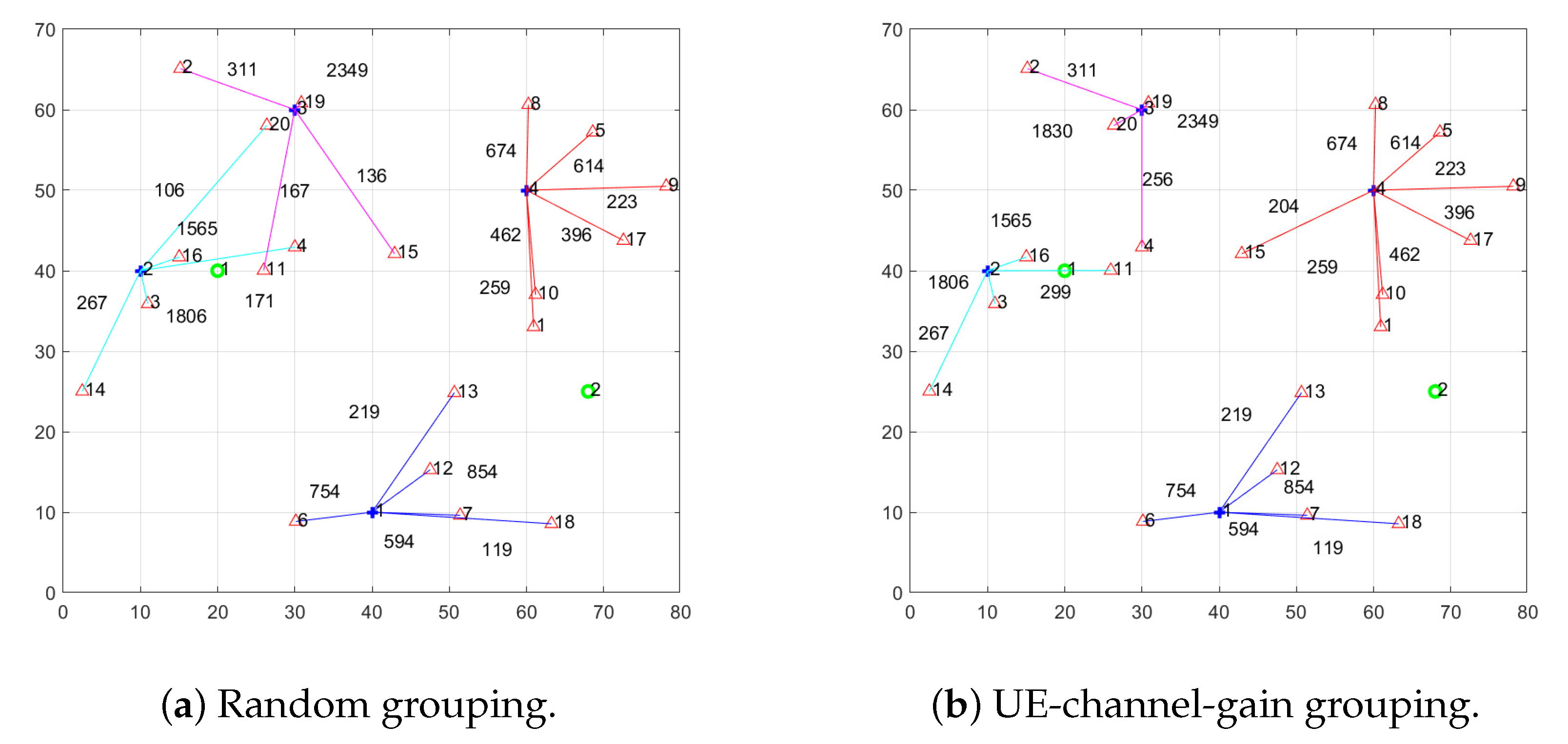 Figure 5a, the channel gain of most UEs associated to drones is 0, which leads to a zero secrecy rate. This is because random-grouping does not consider the signal strength of the UE or the Eve and randomly selects a drone from those within the UE’s signal reception range. Unlike the random-grouping, as shown in