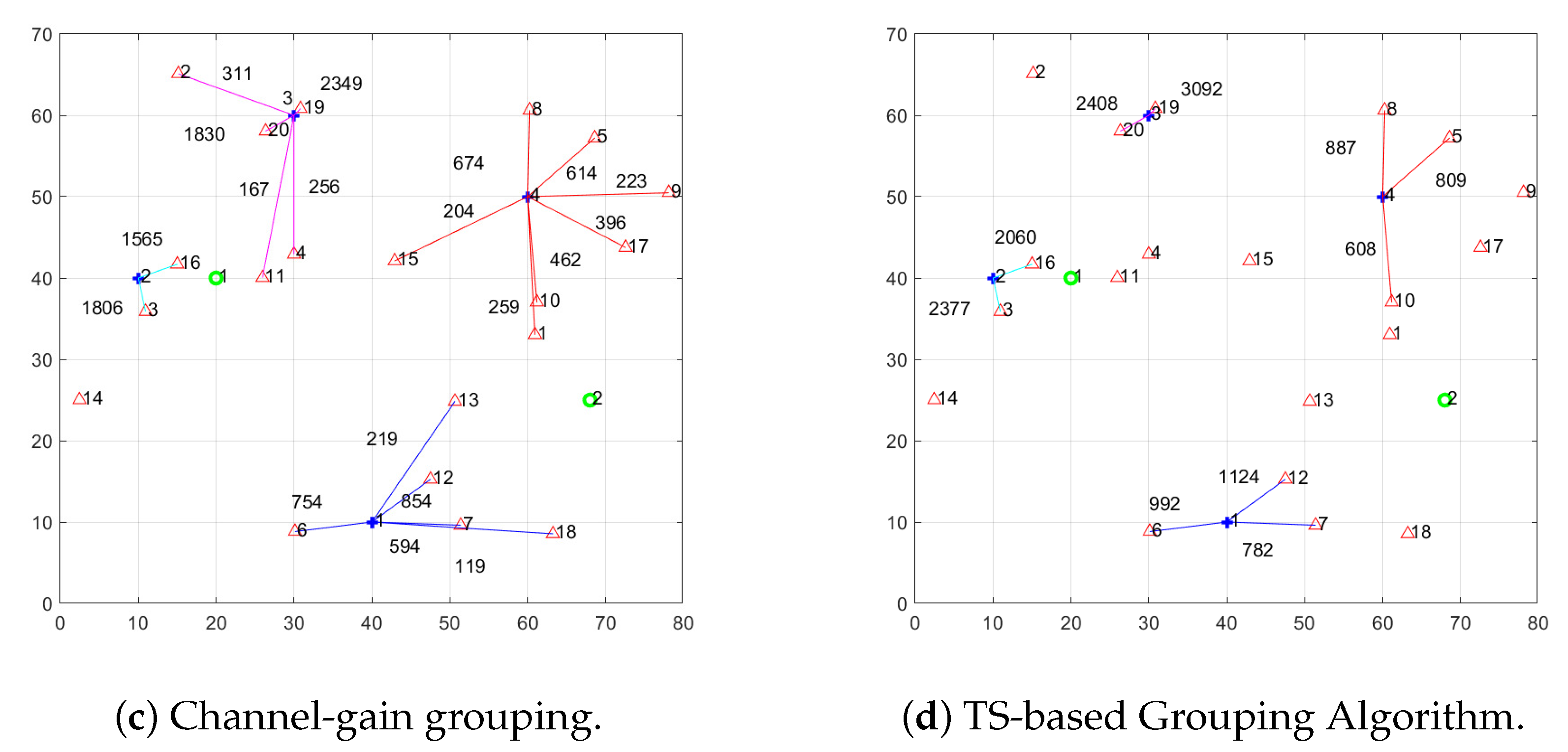 Figure 6a, when the random-grouping is employed instead of TS-GA, it merely selects a drone randomly from those within the UE’s signal reception range, leading to numerous invalid associations that fail to contribute to the security of the system. In