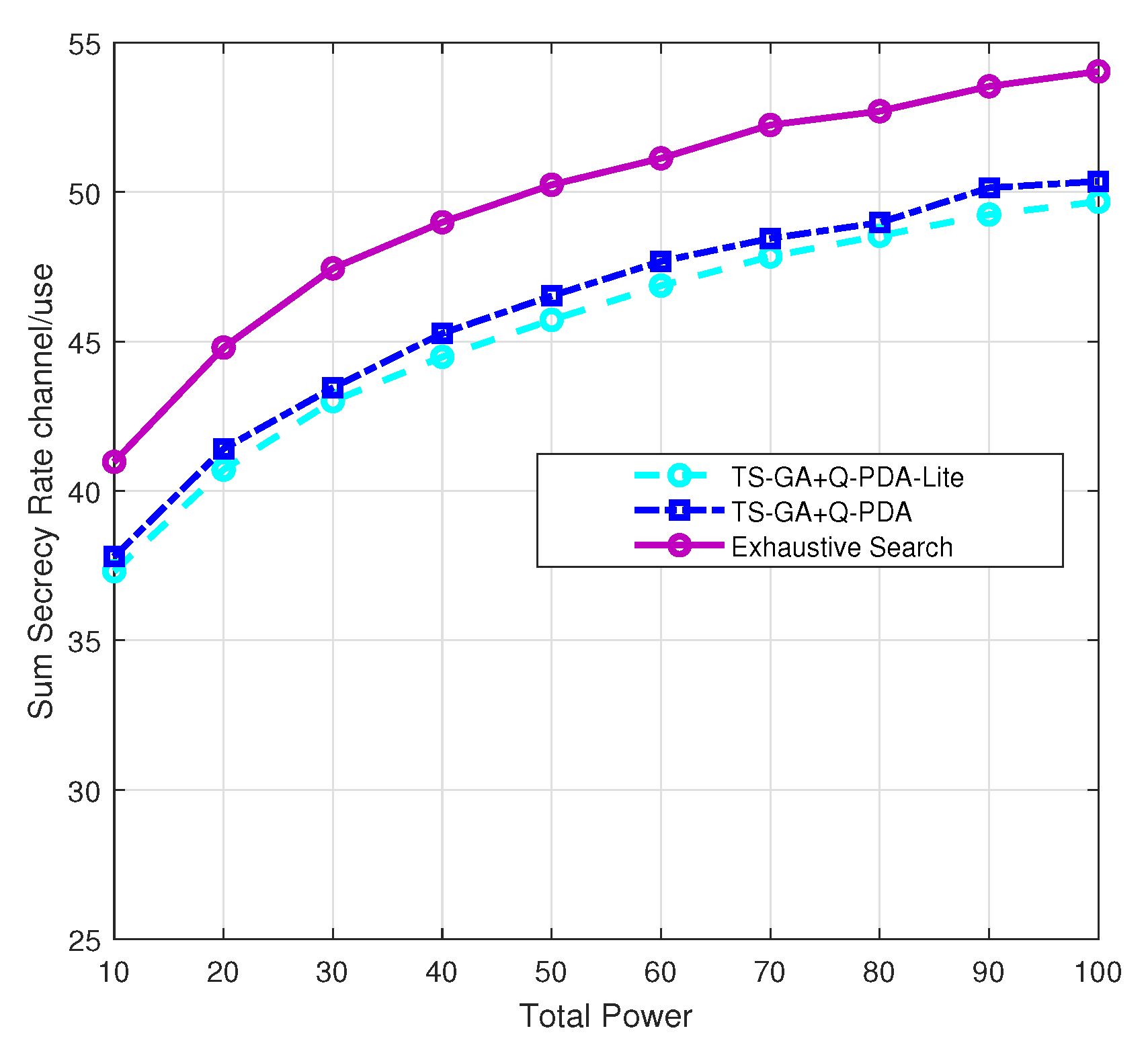 Figure 3, the security performance of TS-GA+Q-PDA is presented and compared with other hybrid algorithms at the drone’s transmit power of 50 W. Among all the hybrid algorithms, TS-GA+Q-PDA achieves the highest worst-case sum secrecy rate, reaching approximately 81 channel/use.