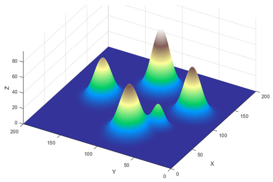 Here, denotes the center coordinates of the k-th peak; is the terrain parameter controlling height; and control the decay rate along the x-axis and y-axis for the k-th peak, respectively, determining the slope; and n is the total number of peaks in the environment. The environment model constructed according to Equation (1) is illustrated in Figure 1.