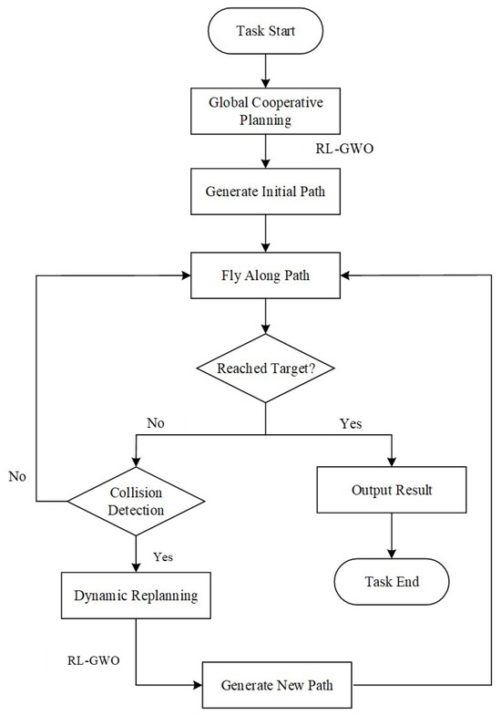 This study adopts a dual-layer planning framework of “offline global planning + online dynamic replanning,” both driven by the proposed RL-GWO algorithm. The framework flowchart is shown in Figure 2.