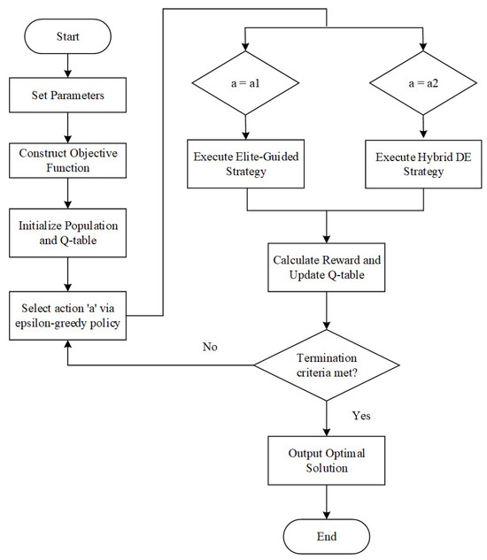 At each decision point, the agent selects an action (update strategy) based on the Q-table and the -greedy policy to update the entire population. After execution, the corresponding Q-value in the Q-table is updated based on the environmental feedback (reward) and the next state. Through this mechanism, the Q-table gradually learns and records which update strategy (action) yields higher long-term rewards at different optimization stages (states). For instance, the elite-guided strategy might receive higher rewards early in optimization, while the fine-search GWO-DE operator might be more advantageous later. Ultimately, the RL-GWO algorithm forms a data-driven, adaptive, dynamic search strategy. The flowchart of the RL-GWO algorithm is shown in Figure 3.