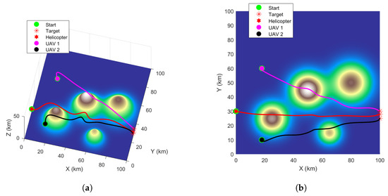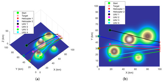 With the rapid advancement of unmanned systems technology, heterogeneous UAV clusters composed of different types of aircraft demonstrate immense application potential in critical infrastructure monitoring, civilian logistics, and emergency search and rescue [1,2,3]. A typical coordinated surveillance and task-execution mission formation often involves fixed-wing UAVs for high-altitude reconnaissance and helicopters for low-altitude precision operations [4,5]. This combination leverages the unique advantages of distinct platforms. However, translating this potential into reliable mission capability necessitates solving the core challenge of cooperative trajectory planning for heterogeneous clusters in complex dynamic environments [6]. Specifically, this problem involves challenges at three levels: