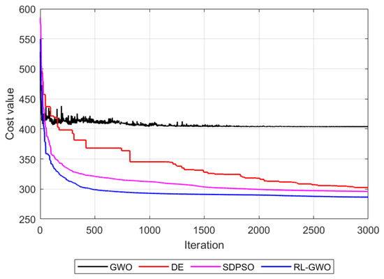 Figure 8 shows the fitness change curves of the four algorithms. The RL-GWO curve exhibits both the fastest convergence rate and converges to the lowest final cost value (approximately 280), significantly outperforming SDPSO (approx. 295), DE (approx. 300), and GWO (approx. 405). This superior performance can be attributed to the reinforcement learning mechanism, which adaptively selects the optimal search strategy. It allows RL-GWO to effectively balance global exploration in the early stages to quickly locate promising regions and local exploitation in the later stages to refine the solution, thus avoiding the premature convergence seen in GWO and achieving a higher quality solution than the other metaheuristics.