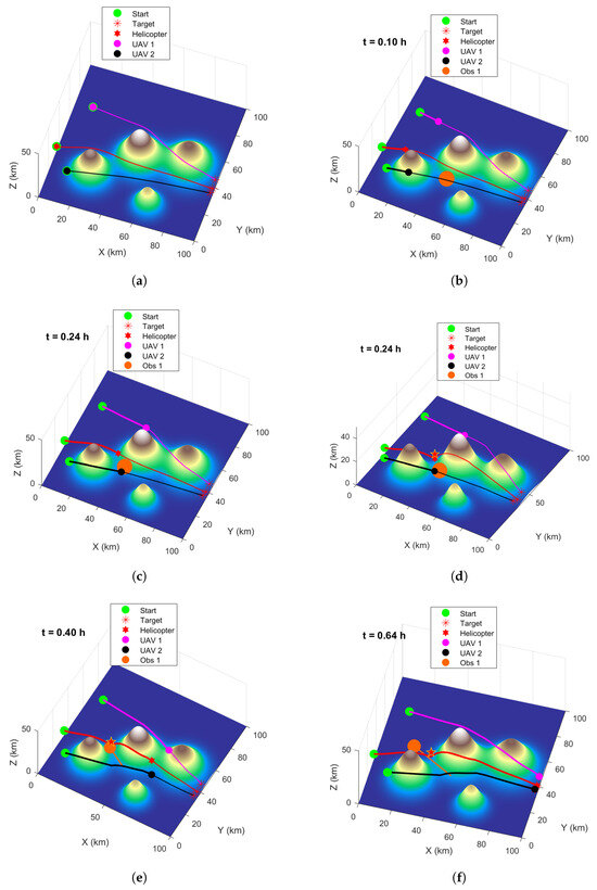Replanning process under dynamic threat. (a) Initial path. (b) Dynamic threat appears ( h). (c) Replanning triggered ( h). (d) New safe path generated. (e) Executing replanned trajectory ( h). (f) Simultaneous arrival at targets ( h).