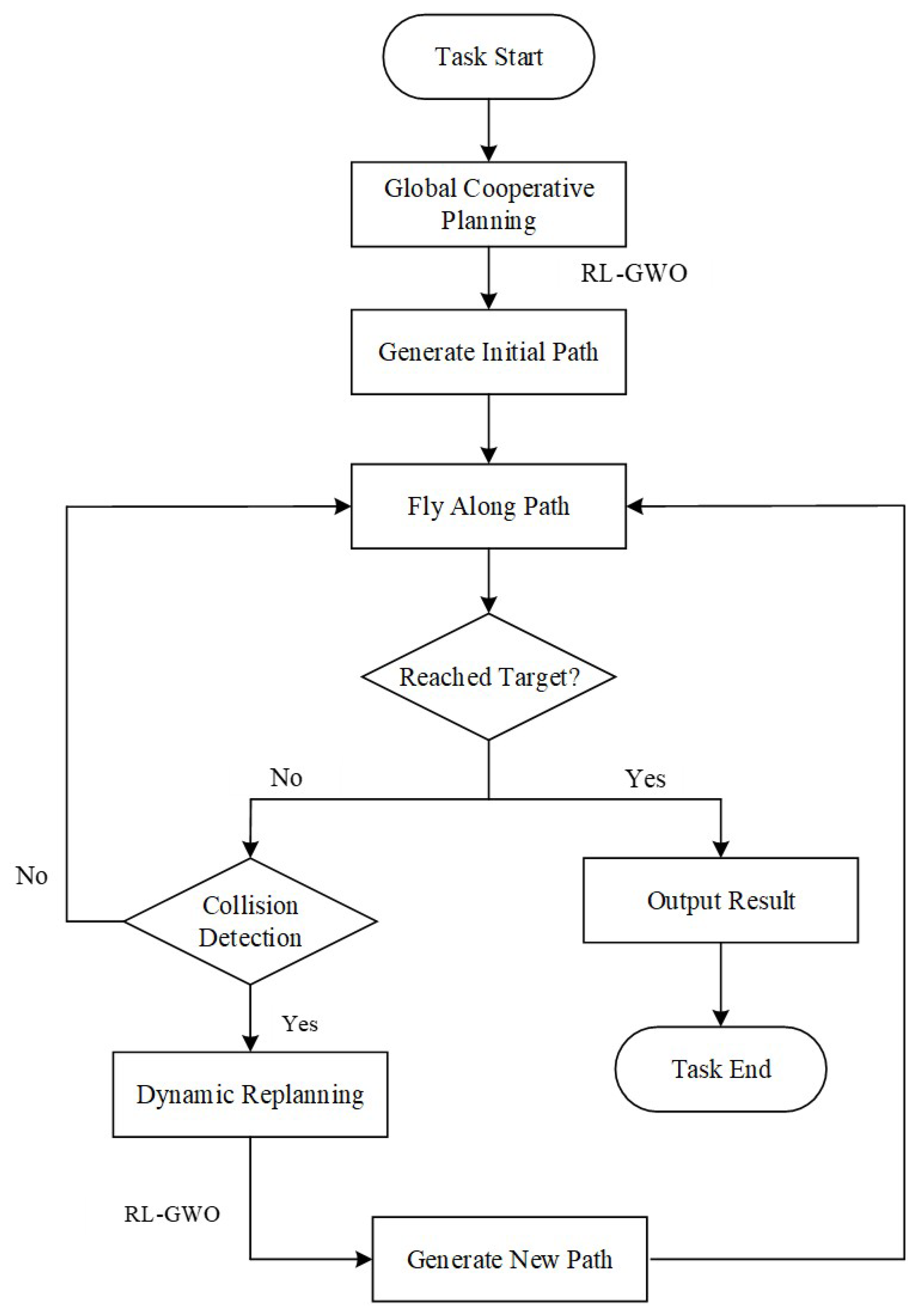 - Global Planning Stage: Before the mission starts, the system takes predefined start/target points and static environment information as input. It invokes the RL-GWO algorithm for sufficient iterations to solve an initial cooperative path plan satisfying all constraints and achieving global optimality.