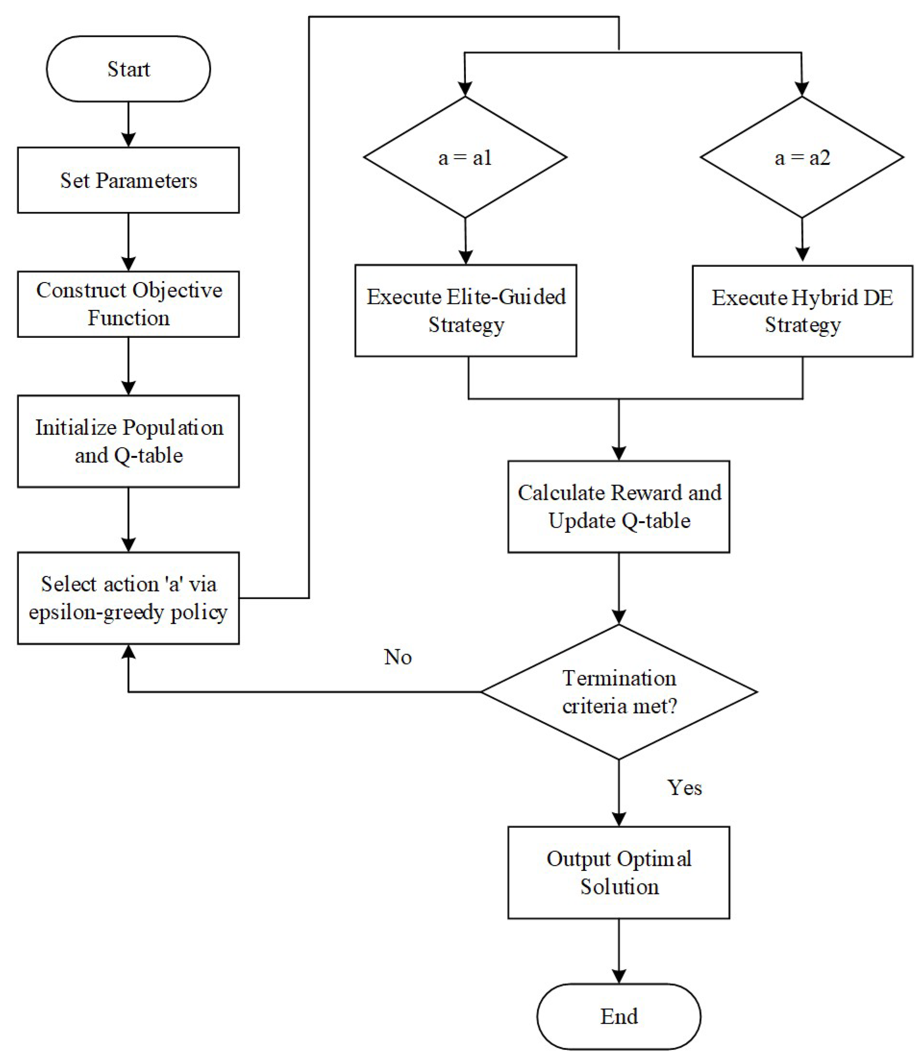- Action: The agent’s action space A is the set containing the two hybrid update operators described above—A = {, execute the the elite-guided strategy, and , execute the hybrid DE strategy}. The Q-table structure is shown in Table 1.Table 1. Q-table framework.