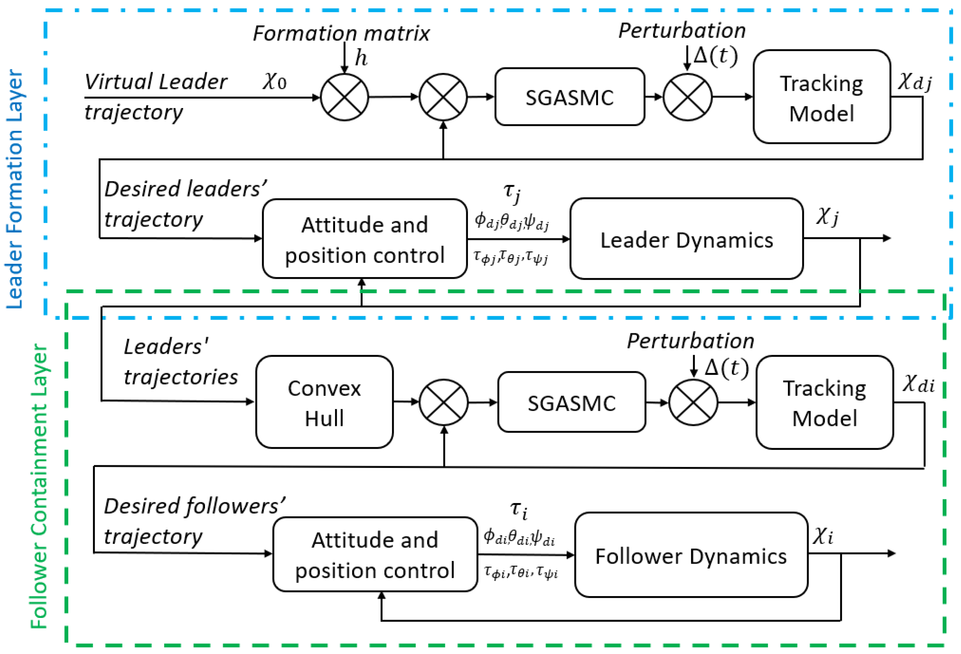 Figure 3 illustrates the control loop that integrates the two control layers. The proposed SGASMC controls the tracking model to set the trajectory of each agent, and low-level attitude and position control ensures maneuverability. The simulated system consists of eight agents: four followers, denoted as