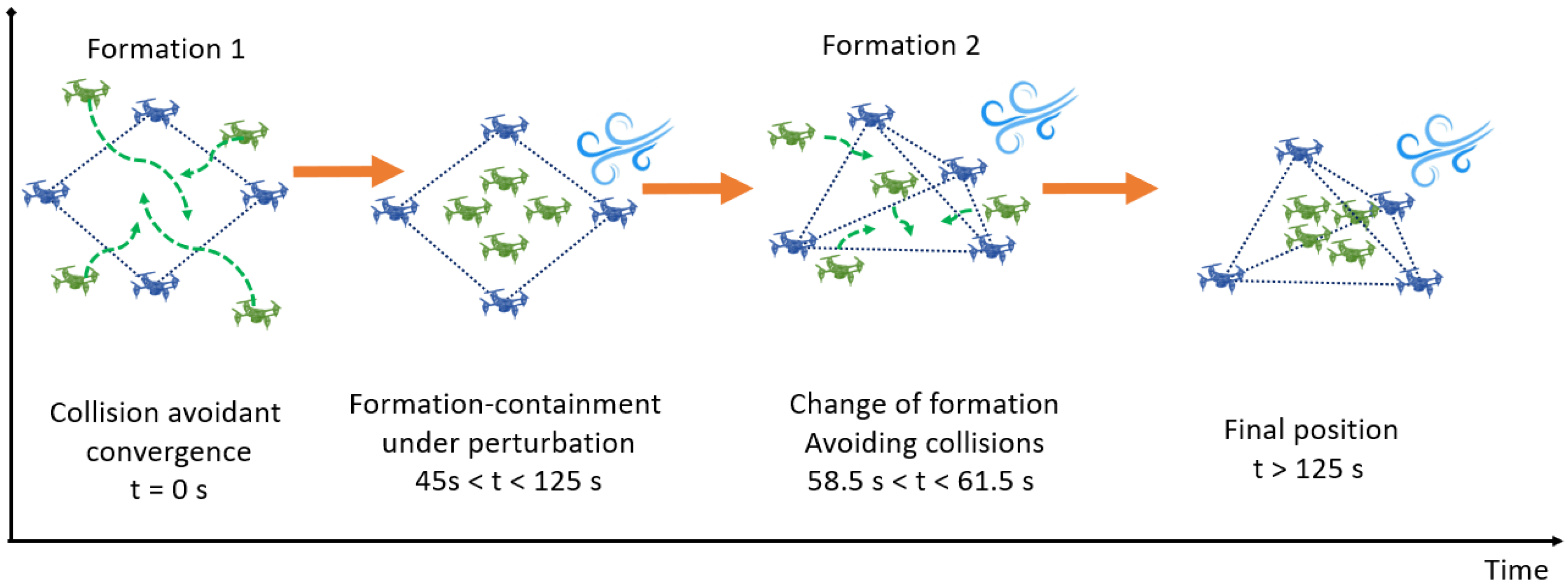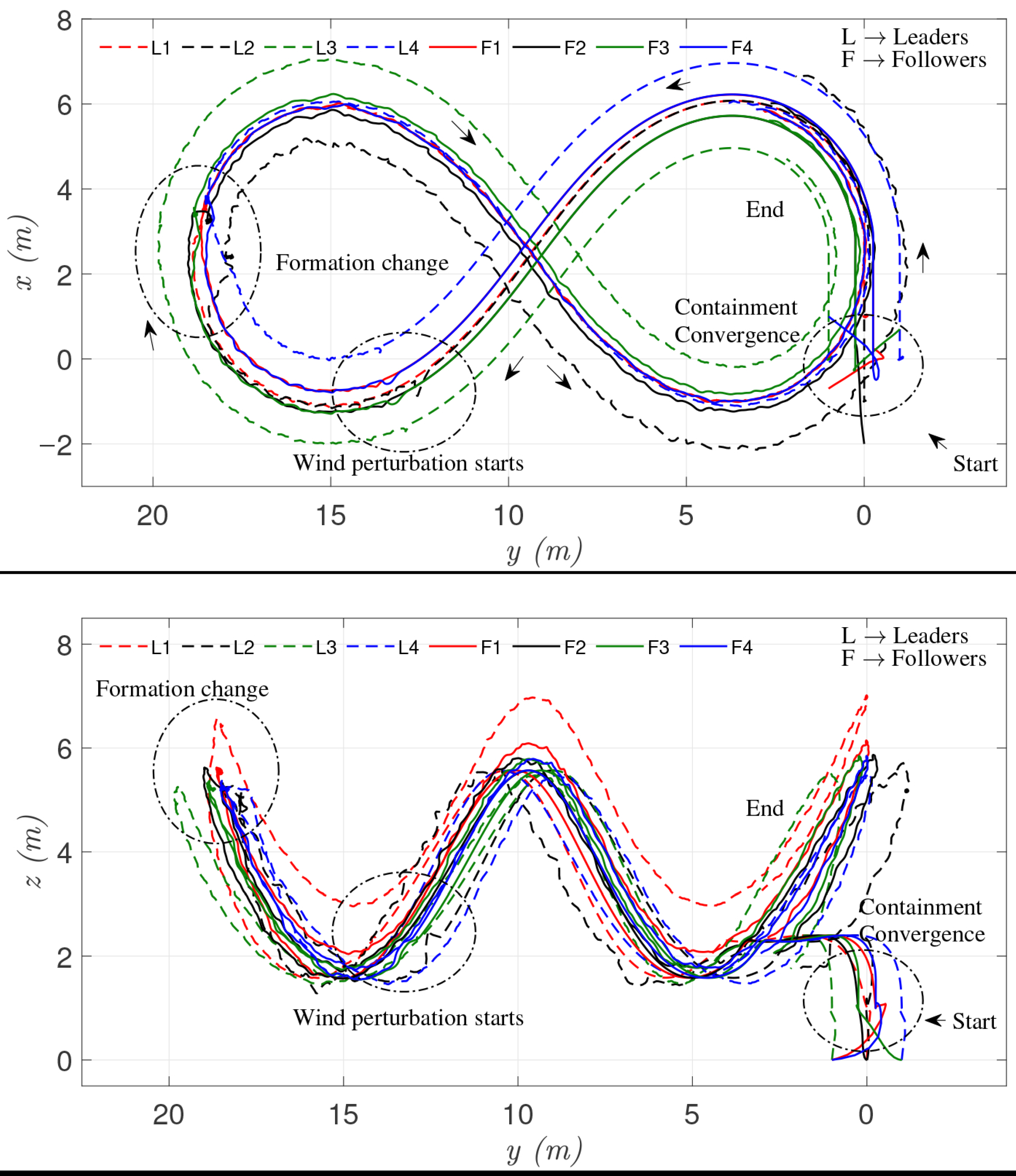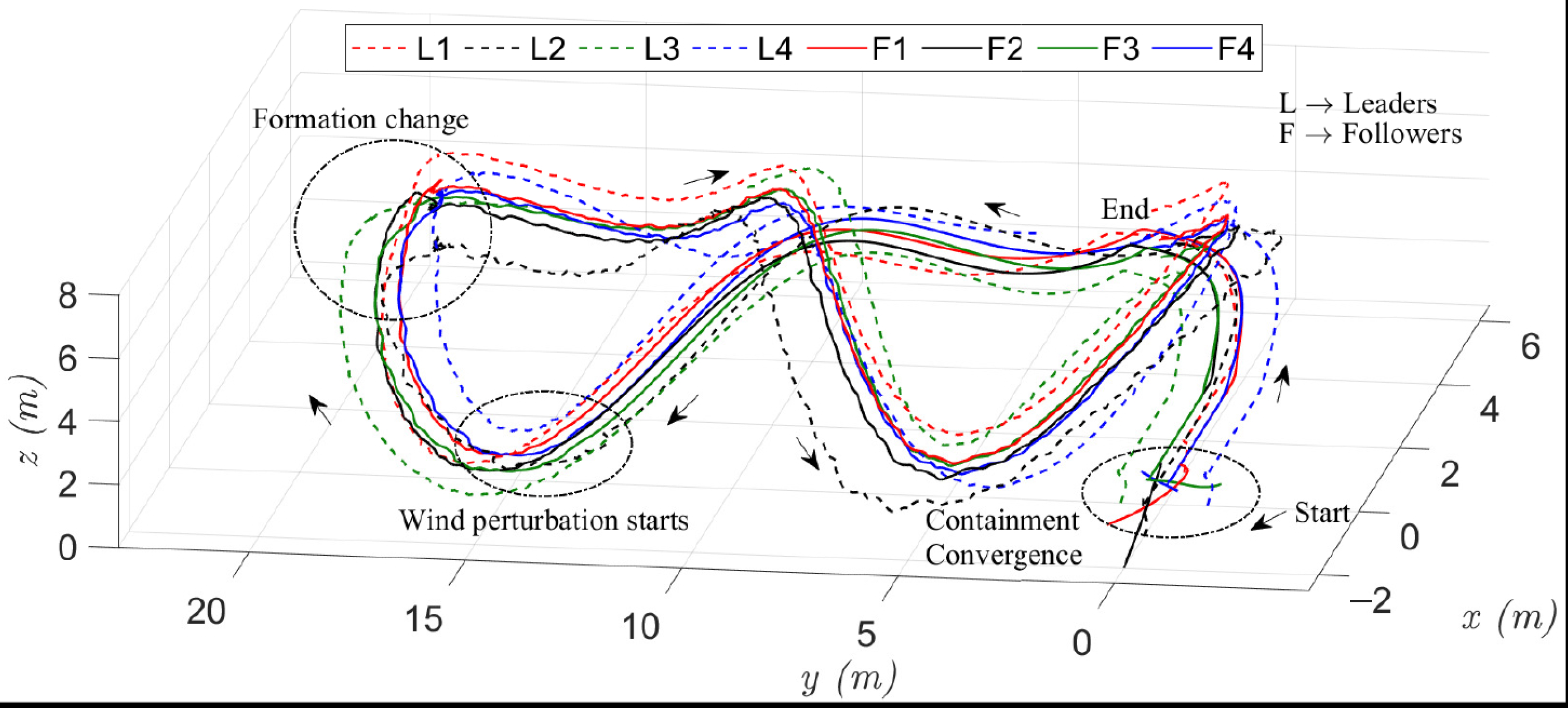 s, the leaders’ formation changes from a square to a tetrahedral shape. In this phase, followers pursue new desired positions that reflect the modification of the leader’s formation, while maintaining the same interaction network. Finally, in the last phase, the system continues to follow the trajectory with the new formation and under the turbulent wind perturbation. A video of the simulation is attached to illustrate the system’s dynamic response. This video (