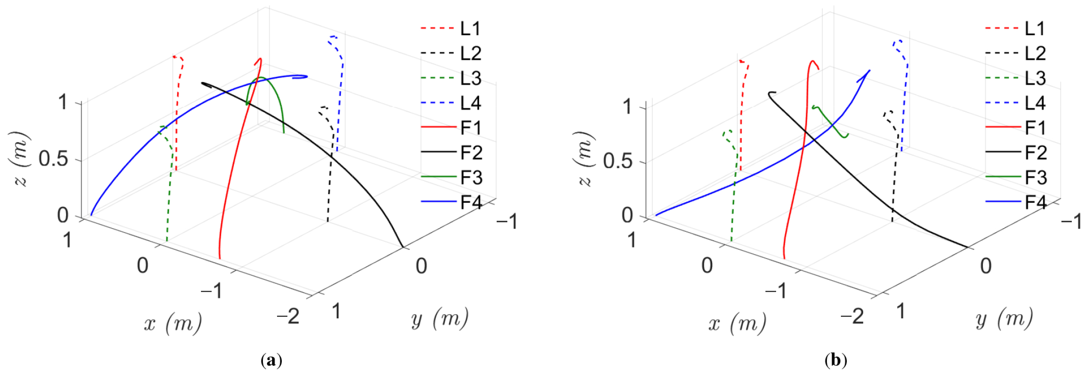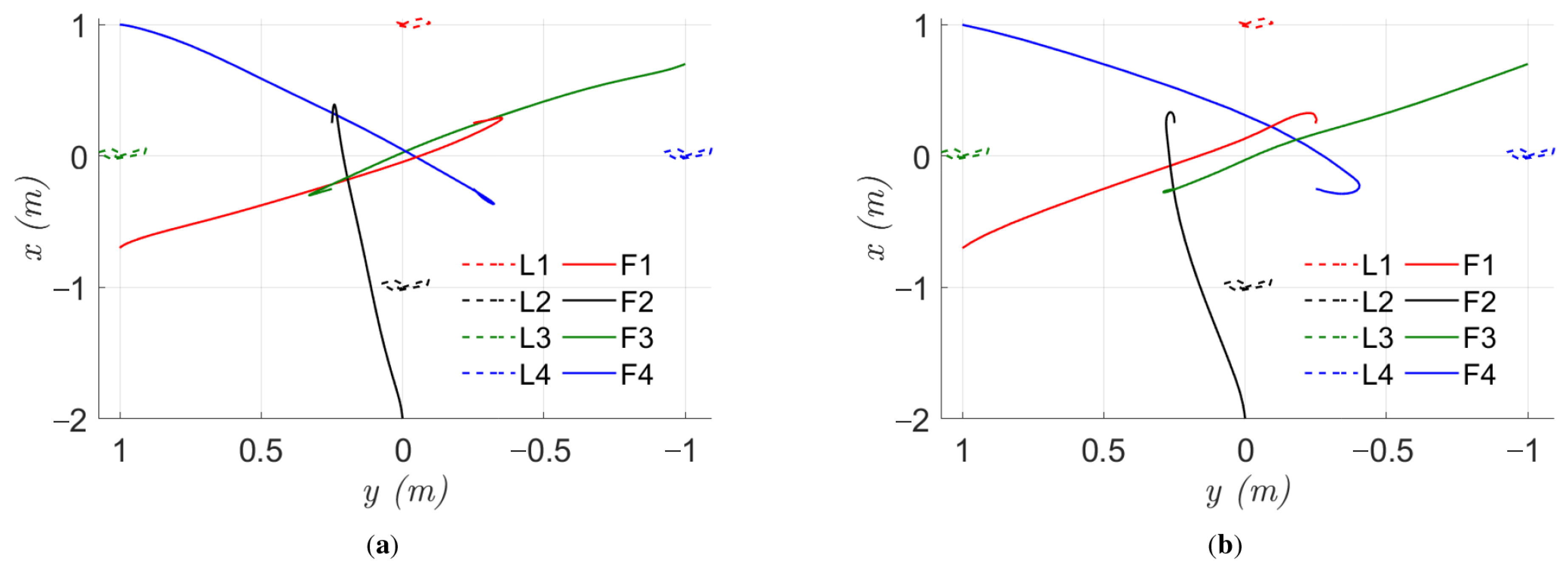 Figure 9 display the convergence phase behaviors side by side for each control approach, using data from the first 5 s of the experiment. With the standard containment strategy, followers aim for their target positions by the shortest path. This can result in collisions, especially if the initial setup causes their paths to cross. For demonstration, the initial conditions were specifically chosen to create intersecting trajectories, illustrating how followers often reach their assigned altitude simultaneously and cross paths, which increases the risk of collision. In contrast, subsection (b) of the figures demonstrates the effects of the proposed collision avoidance error. Here, followers do not move directly to their desired positions. Instead, the control adjusts each follower’s trajectory to avoid the expected desired positions of nearby agents. For example, follower F1 approaches its desired position from above, overshooting the required altitude before descending to it. F4, in turn, stays lower and follows a rising arc to join the formation from below. F2 and F3 show milder adjustments; F2 adds a slight curve to its path, giving F3 enough space to approach its position almost directly. This coordinated avoidance is achieved without relying on external sensors. Each follower maintains a safe distance using only the interaction network matrices and information shared by its neighbors. The followers’ desired positions are determined by the submatrix
