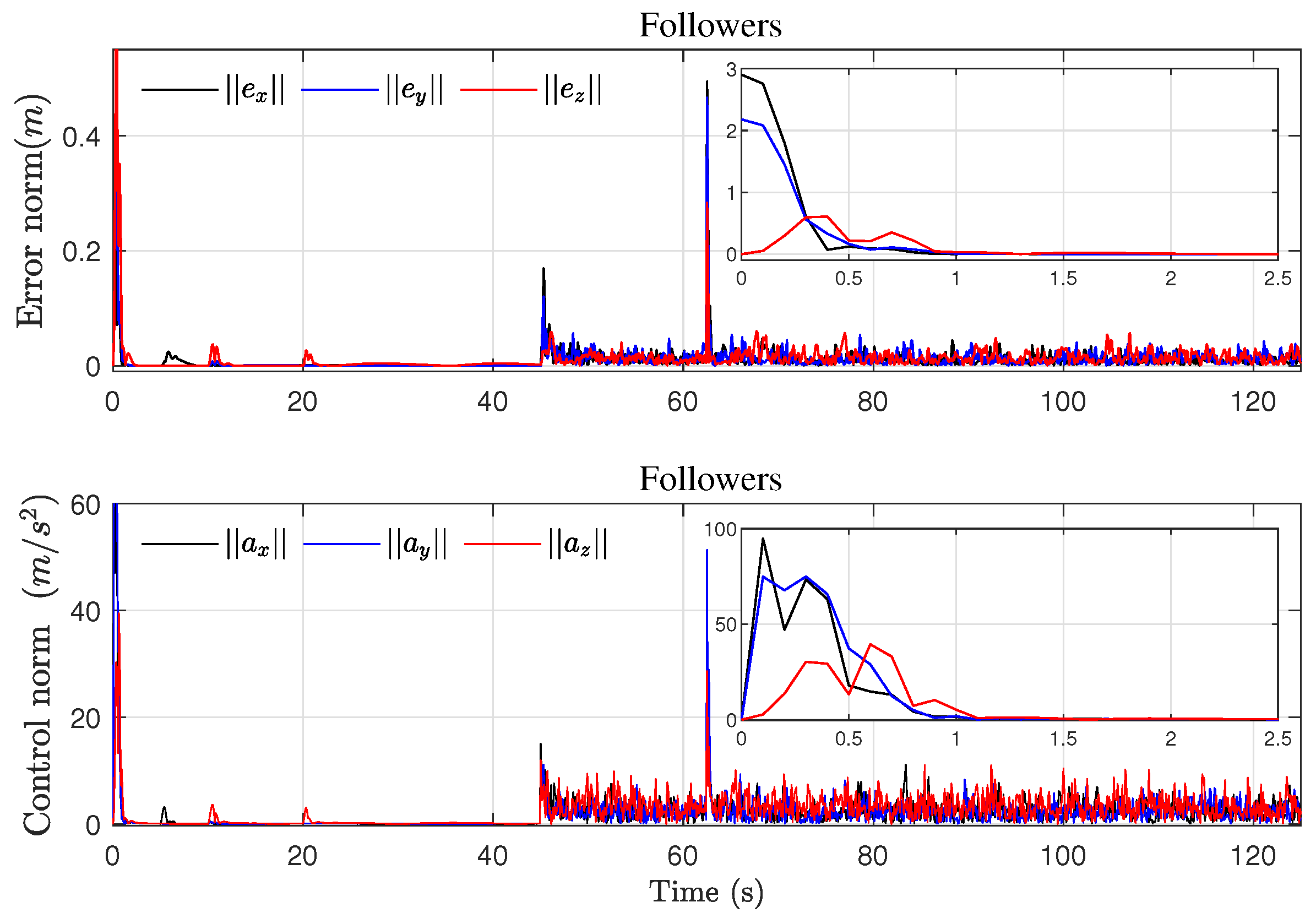Figure 10 shows the norm of the position error and control input for the follower agents. The error represents the deviation between the actual follower positions and the desired positions defined by the convex hull formed by the leaders. This serves as an indicator of the containment performance, which is also illustrated in the lower panel of the figure, demonstrating that the magnitude of the control effort is within the capabilities of the MAVs.