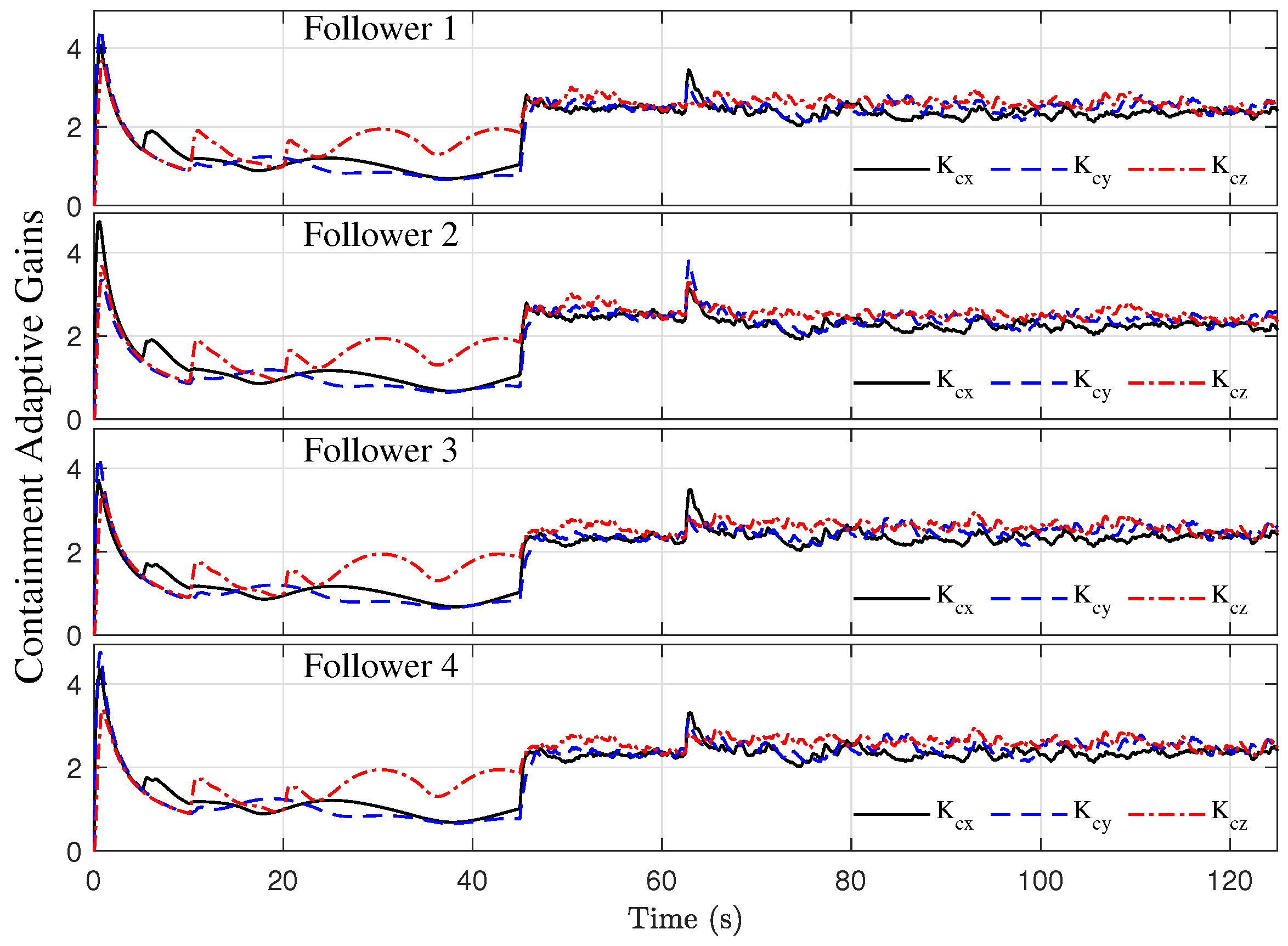 Figure 11 displays the evolution of the adaptive control gains for the followers under turbulent wind conditions. The variations in these gains reflect the controller’s real-time adaptation to external disturbances, highlighting its ability to maintain stability and performance despite environmental perturbations.