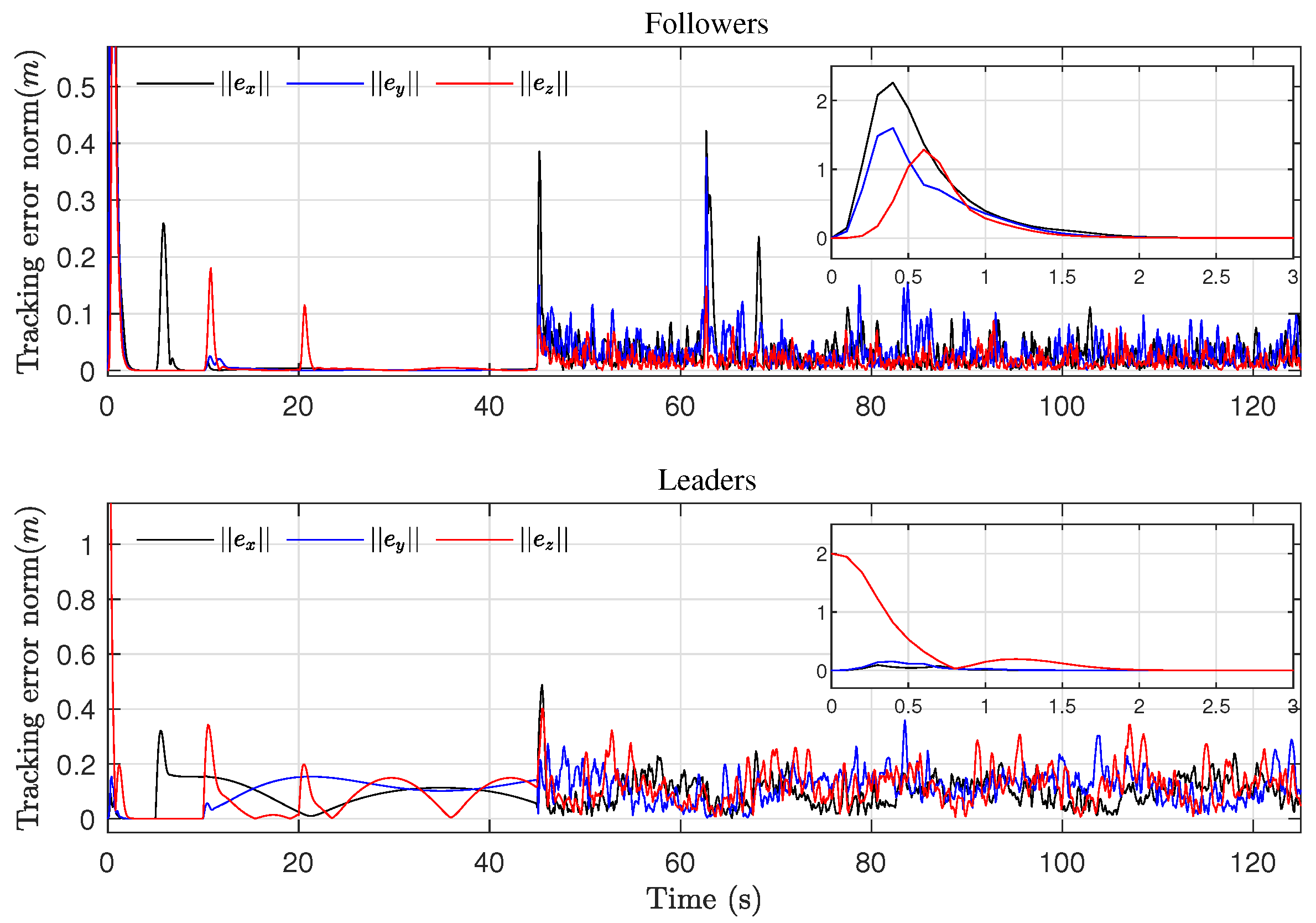 Figure 12 presents the tracking error norm for both followers and leaders. This error quantifies each agent’s deviation from its respective reference trajectory, providing a measure of the overall system tracking performance. While the error exhibits spike increases, these are primarily due to the inertial effects inherent in the quadrotor dynamics. Importantly, these fluctuations remain within the allowable performance bounds of the vehicles. Notably, the leaders experience greater deviations than the followers under wind disturbances. This disparity occurs because the convex hull, which defines the formation, moves in response to leader displacement caused by disturbance. Conversely, the virtual leader, unaffected by atmospheric turbulence, continues along its predetermined trajectory, causing the leaders to exhibit a greater deviation from the ideal path under turbulent conditions.