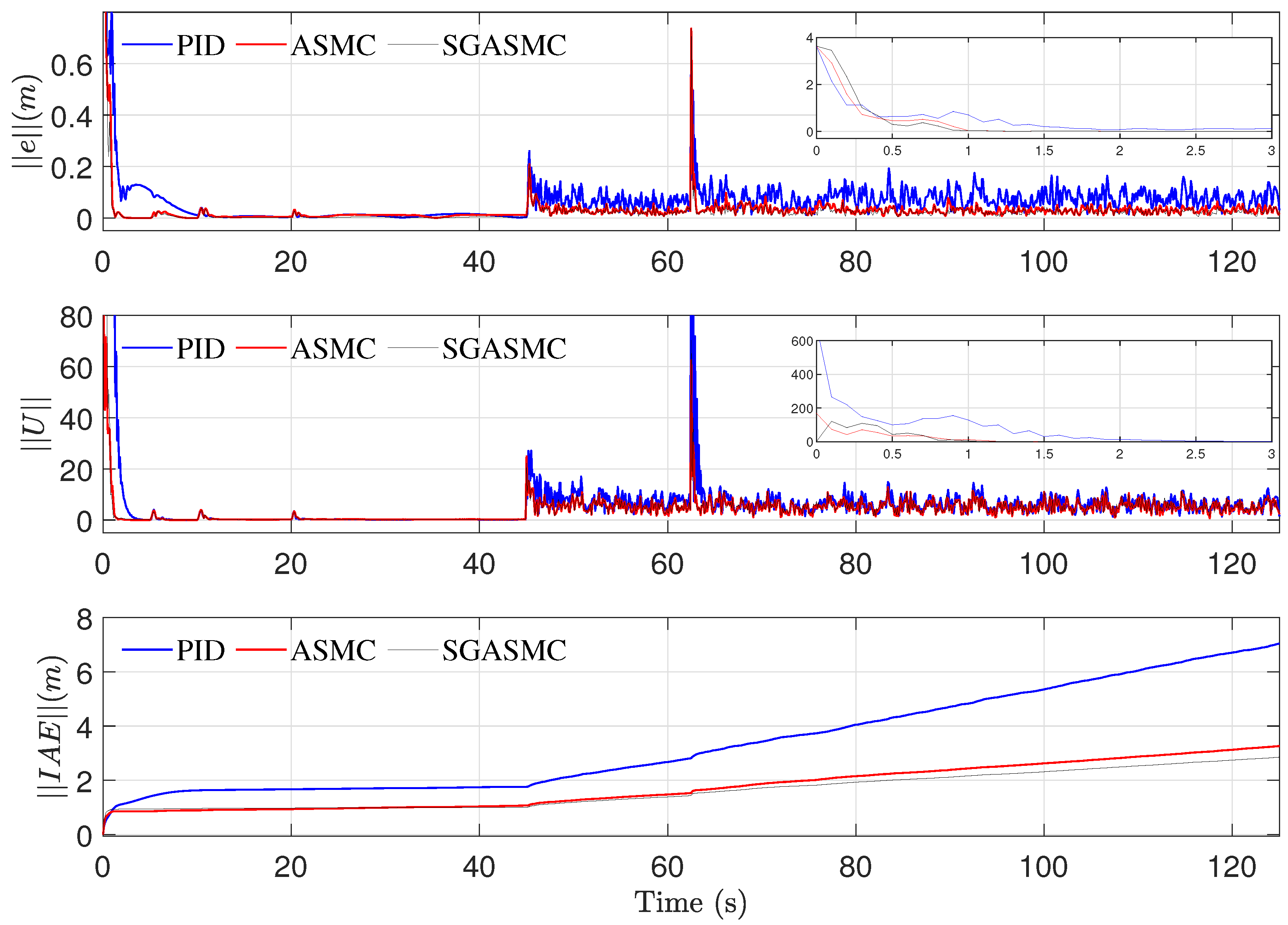 Figure 13 compares the performance of three control strategies in terms of the error norm, control effort norm, and integral absolute error (IAE) norm. All controllers were implemented within the same feedback linearization framework, with the control input