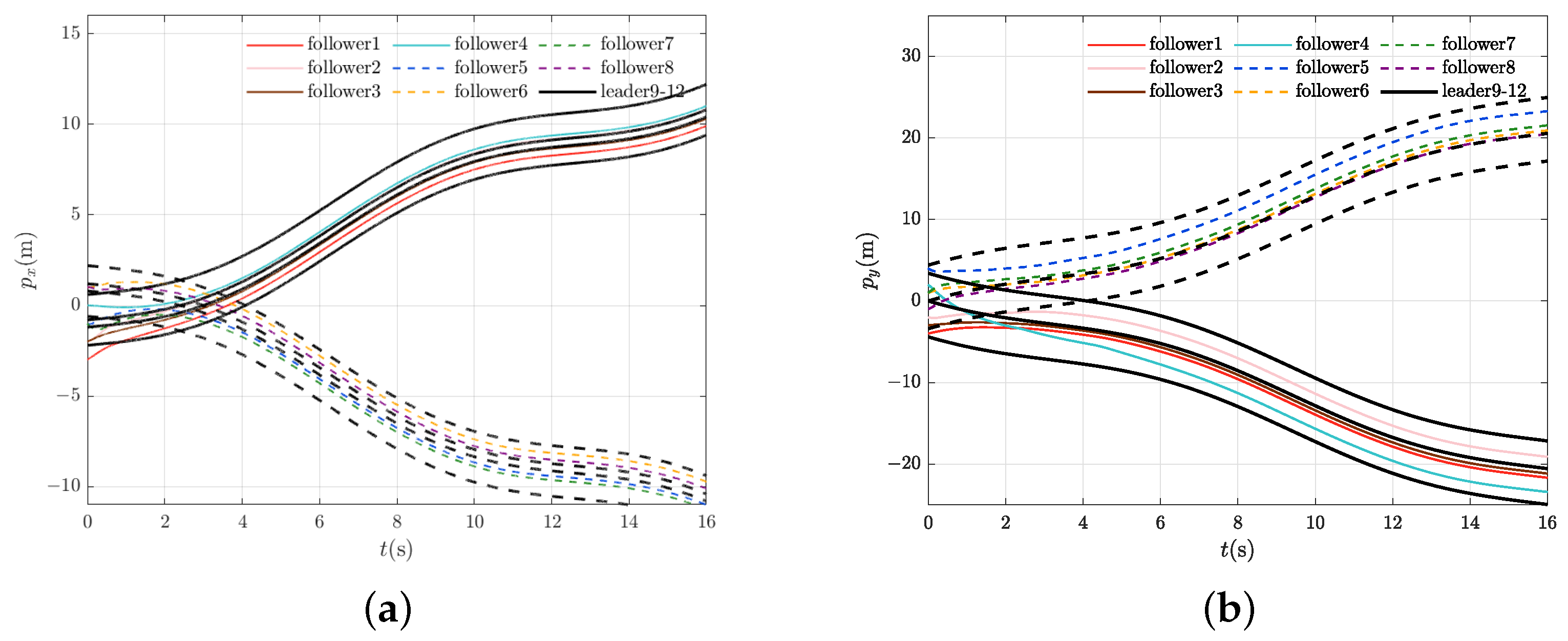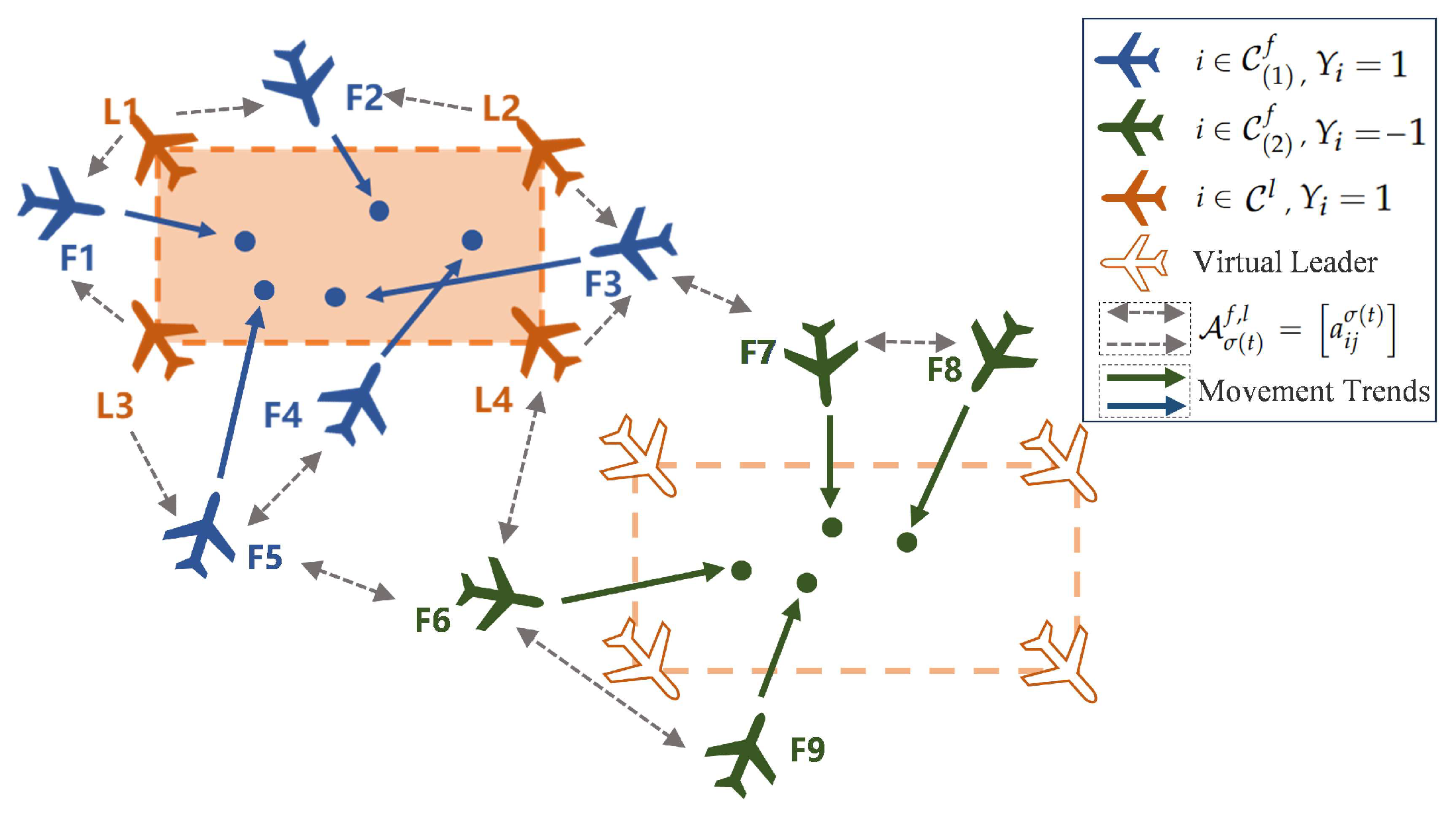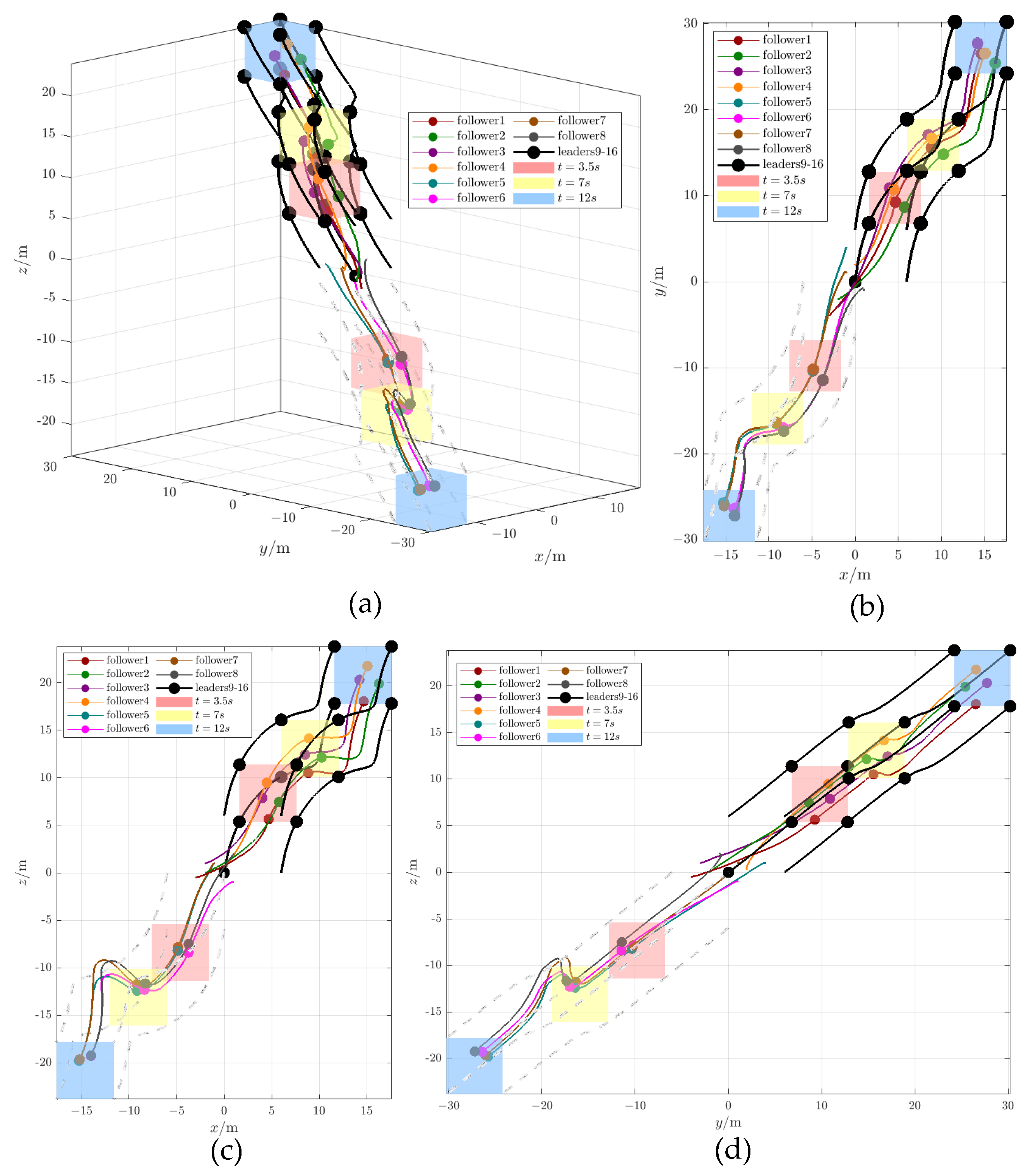 - Li, W.; Zhou, S.; Shi, M.; Yue, J.; Lin, B.; Qin, K. Collision Avoidance Time-Varying Group Formation Tracking Control for Multi-Agent Systems. Appl. Intell. 2025, 55, 175. [Google Scholar] [CrossRef]