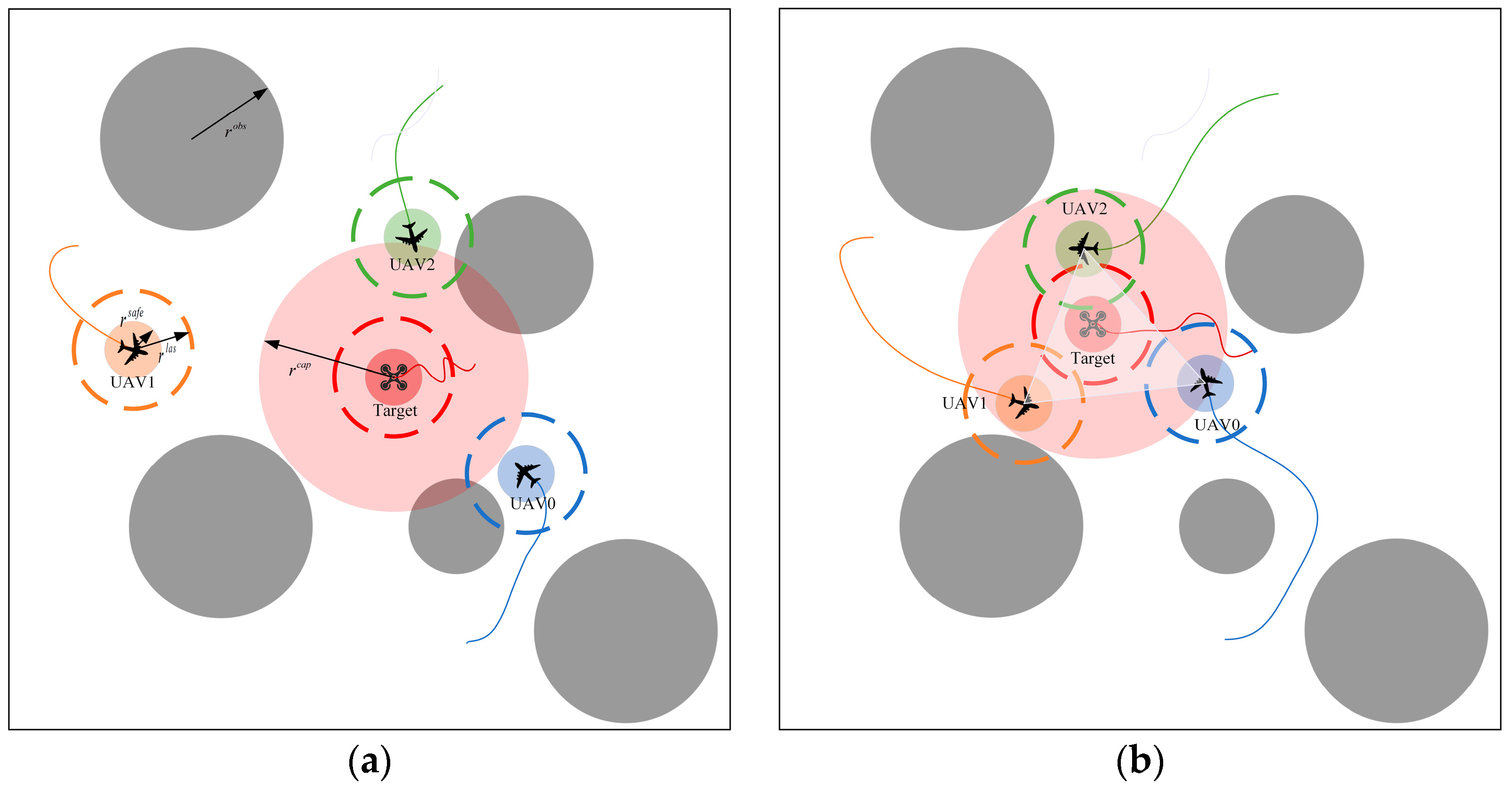 A collision failure is determined if any UAV approaches an obstacle, another UAV, or the environment boundary closer than the predefined safety radius. An encirclement step is considered complete when all UAVs_e enter the UAV_t’s capture range without collision and form a surrounding trend, as illustrated in