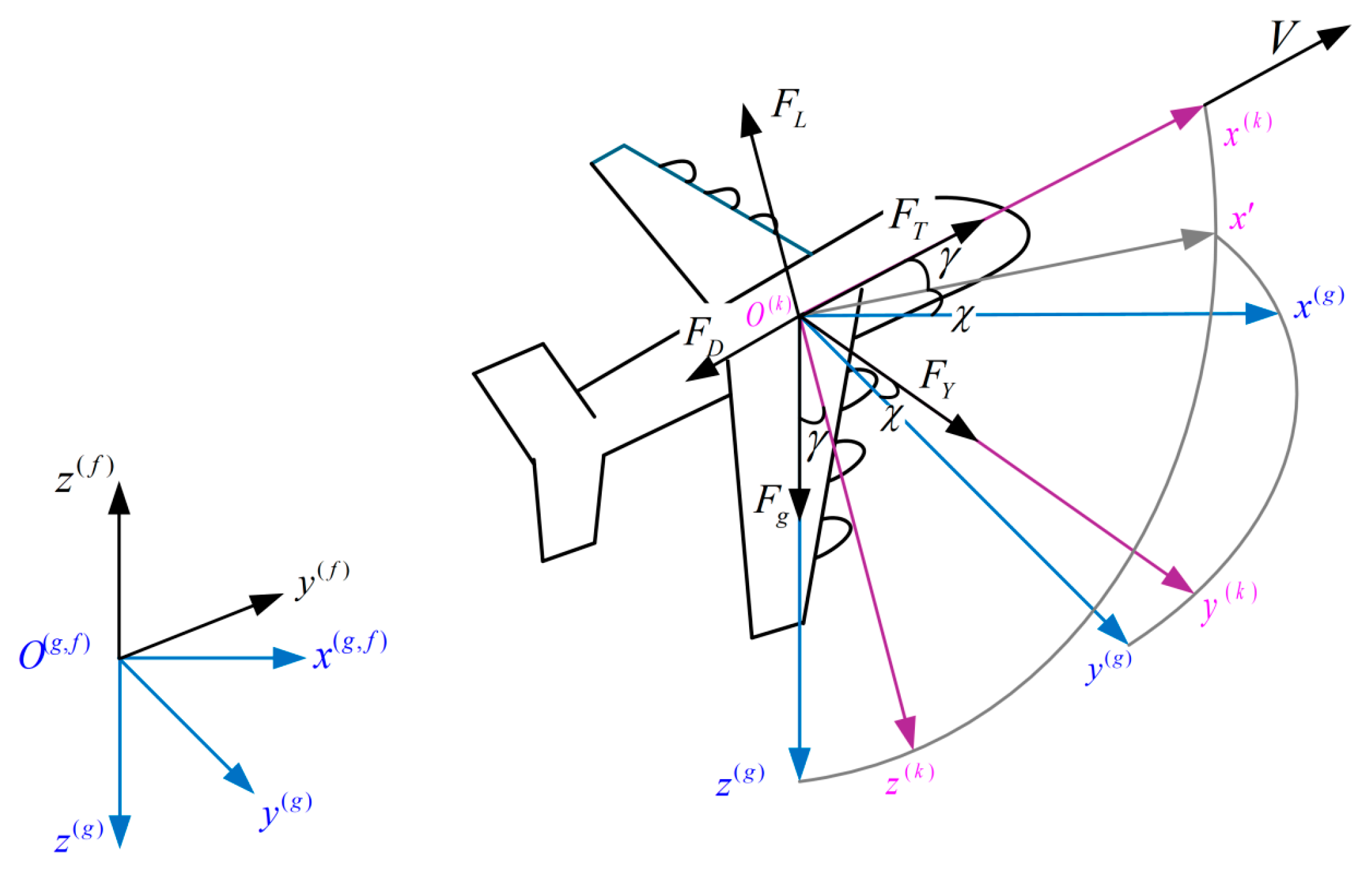 In the simplified model, the velocity coordinate system coincides with the body coordinate system, and the flight altitude is assumed low, with the ground approximated as a plane. The transformation matrix from the trajectory coordinate system to the ground coordinate system is given by: