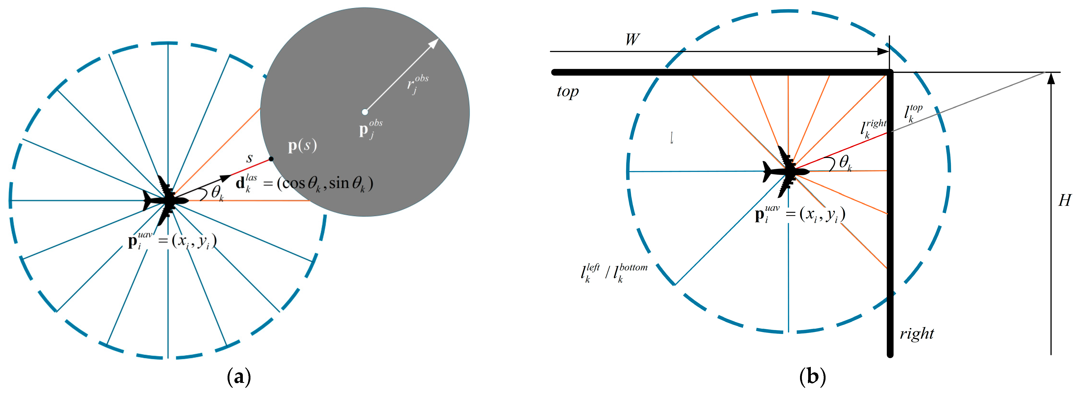 The perception of each UAV is modeled using laser beams. A total of beams are employed, with a detection range of . The direction of the -th beam is denoted as , and its detected distance is given by .