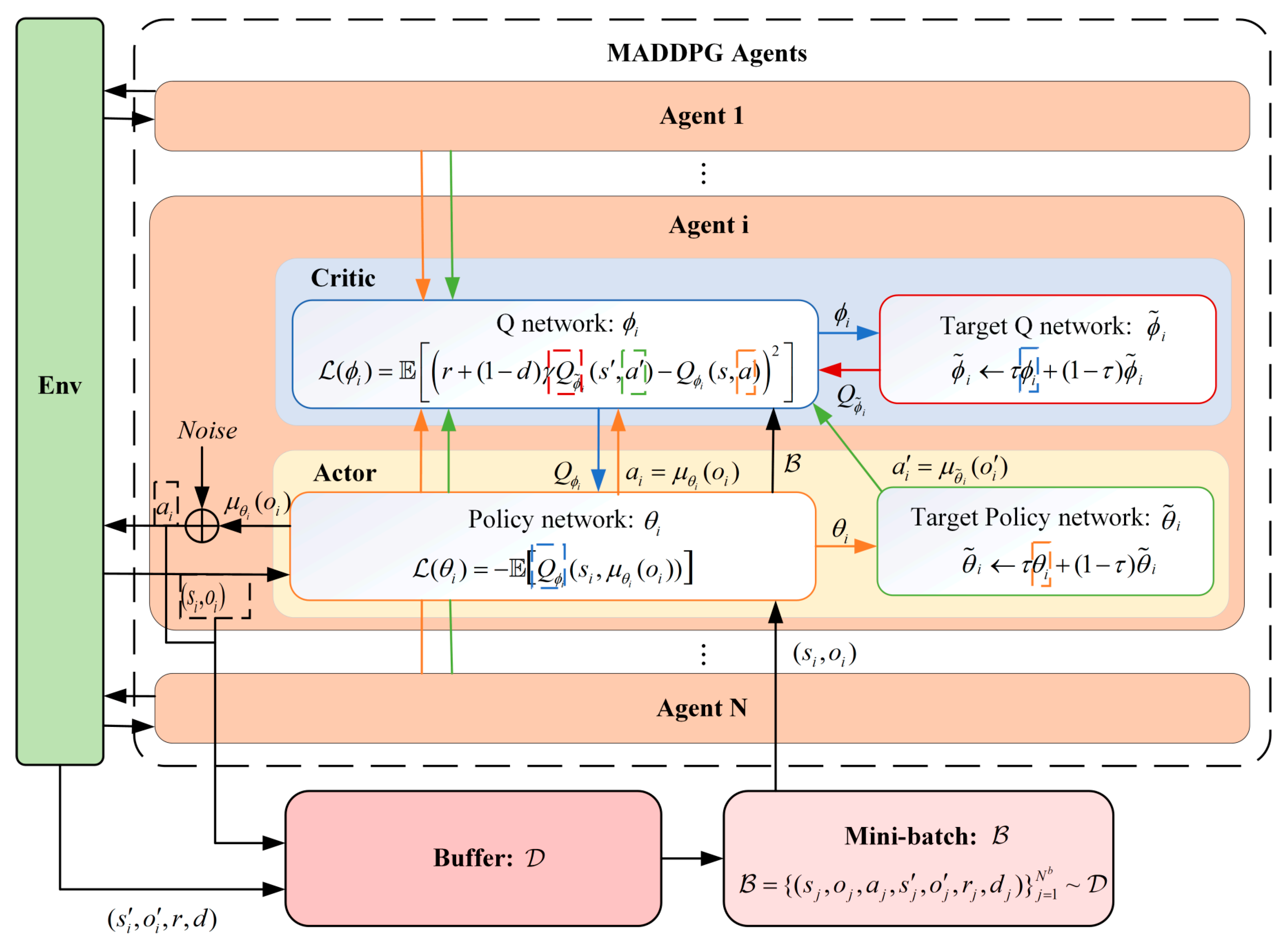 11] enabled multi-agent cooperation through value function decomposition, which proved effective in discrete action spaces. However, these approaches cannot be directly applied to physical systems with continuous control inputs, such as UAVs. To address this issue, Lowe et al. proposed Multi-Agent Deep Deterministic Policy Gradient (MADDPG) [