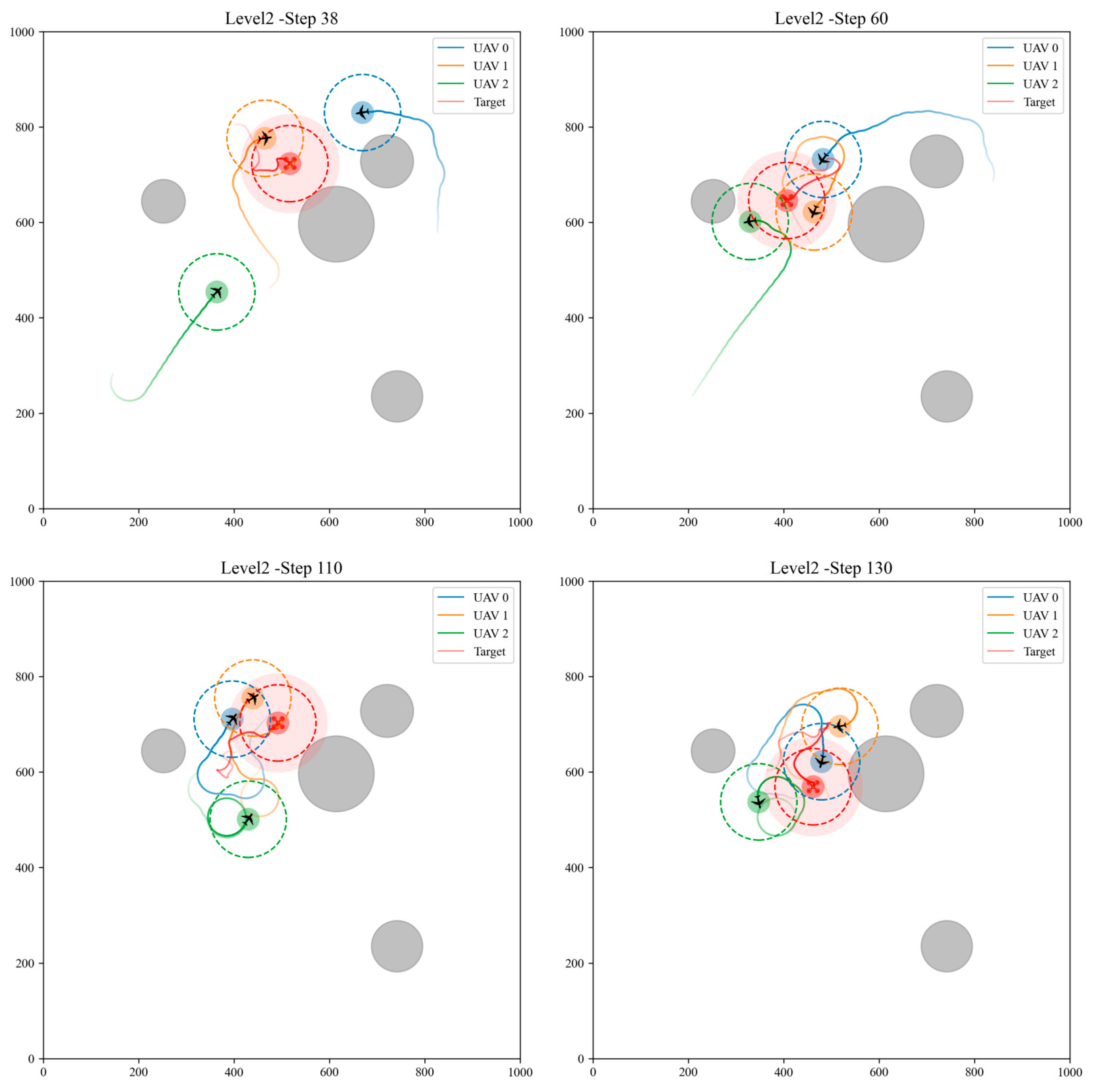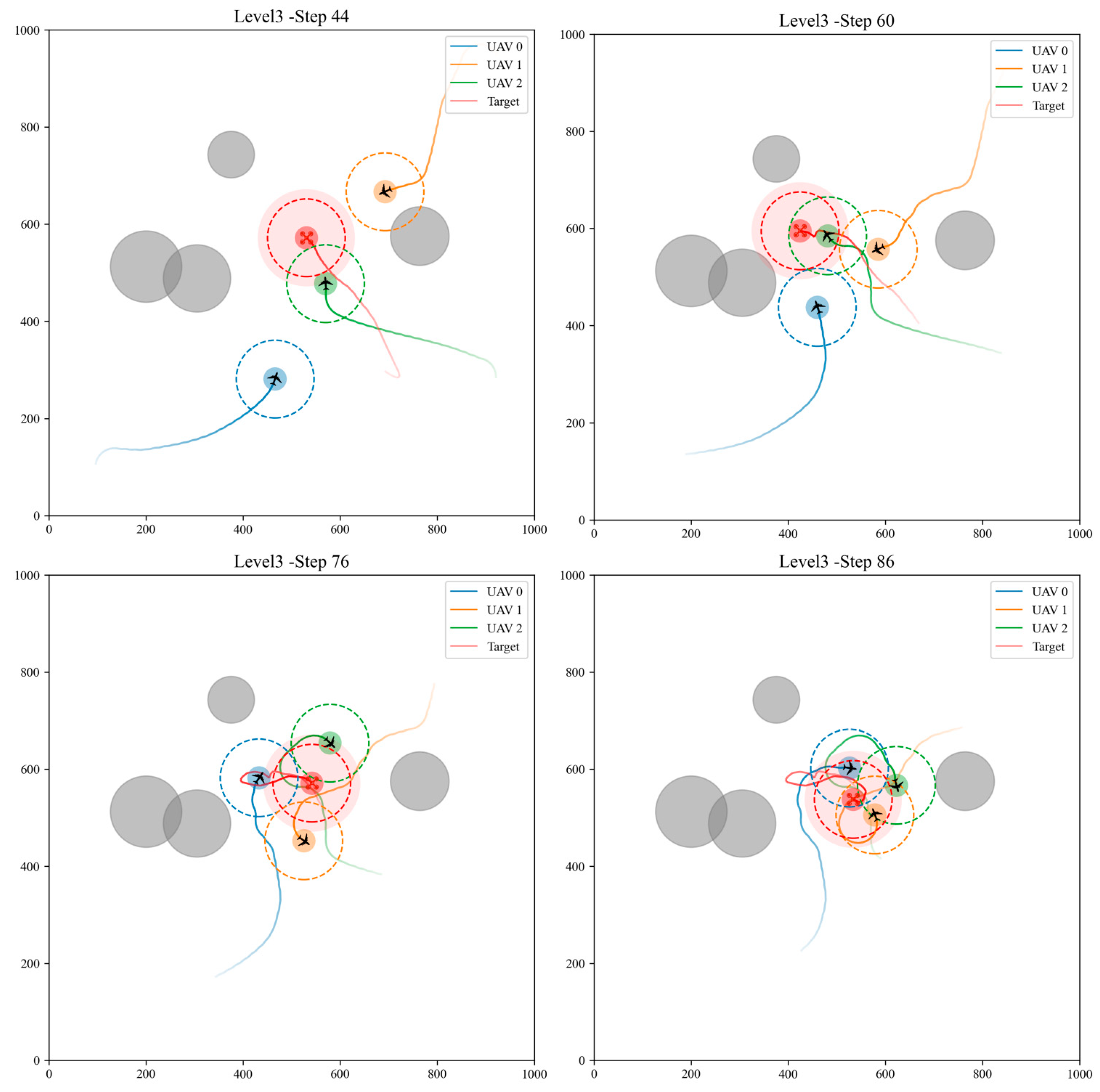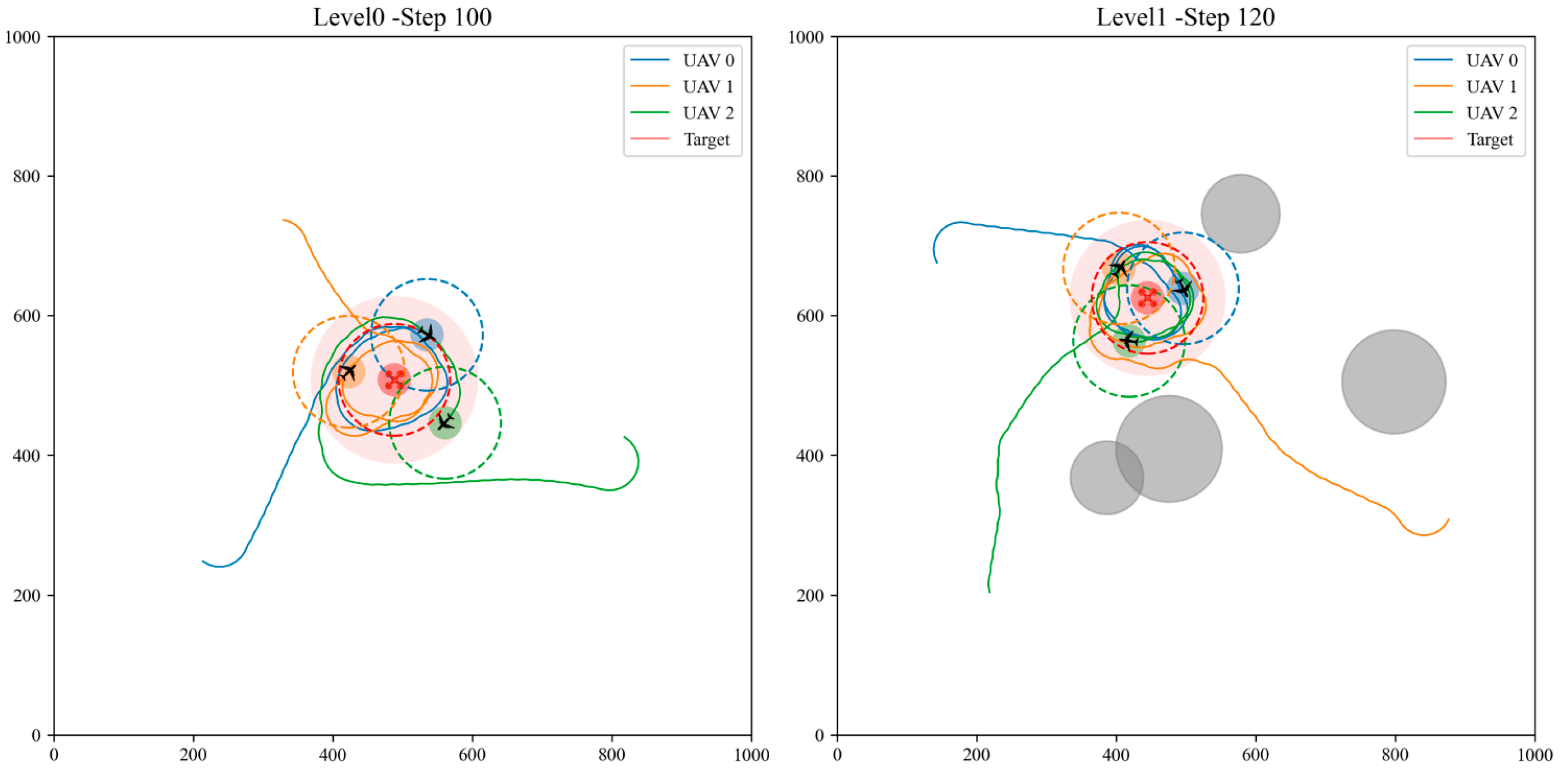 Figure 6. In Level 0, UAVs_e enter the capture range and circle around the UAV_t. Level 1 UAVs can avoid obstacles while approaching the UAV_t.