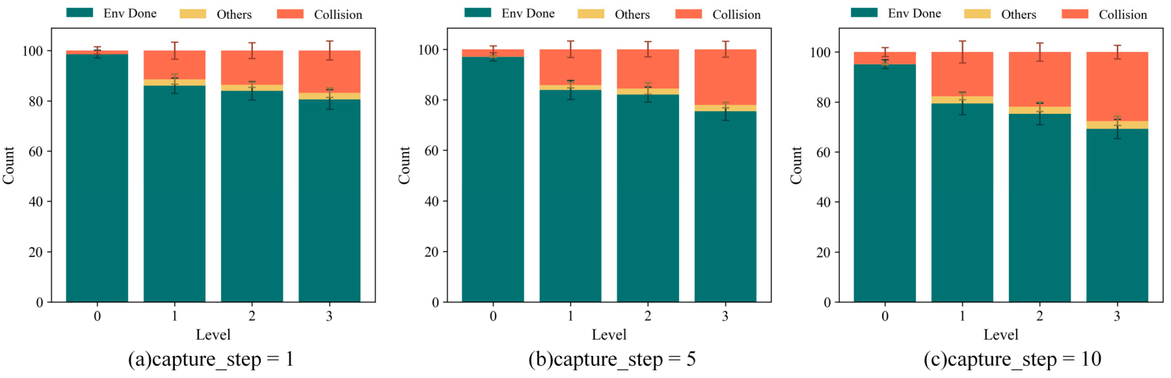 In experimental evaluation, 1000 episodes were conducted for each level, calculating capture success rates for every 100 episodes. To ensure robustness, error bars are included. The results are shown in