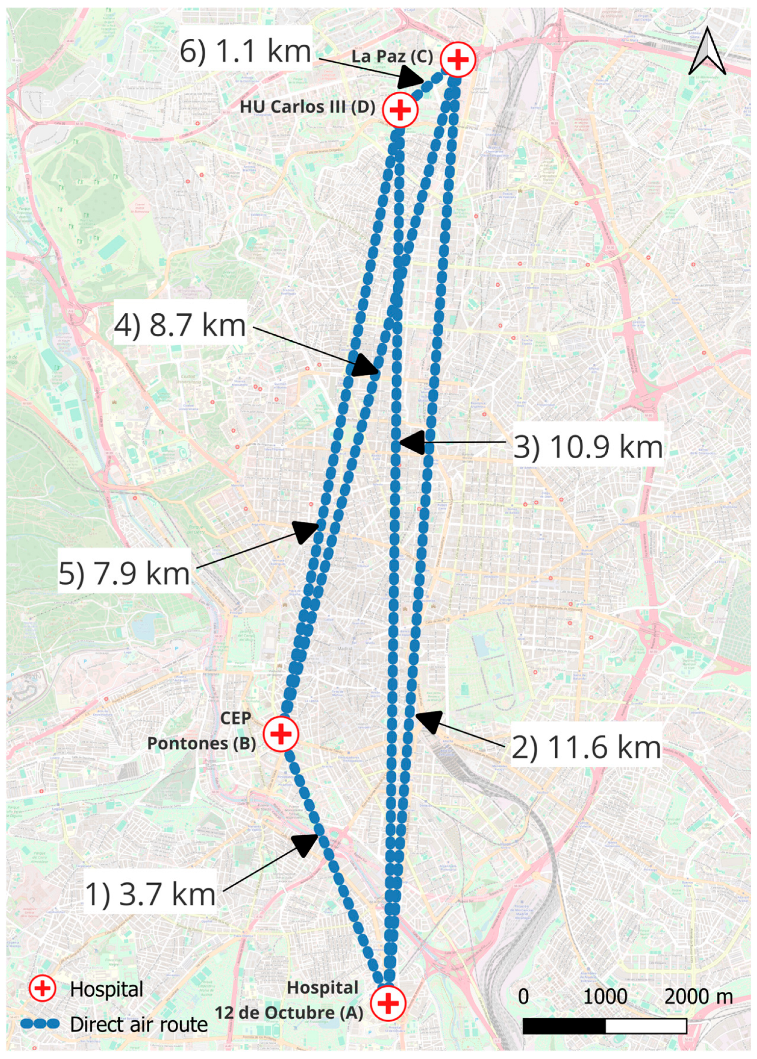 Figure 1 shows the route network resulting from connecting all the hospitals considered for this case study. The current scenario assumes direct flights between each of the four selected hospitals, which results in six distinct hospital pair routes, marked with an identification number from 1 to 6. Distances of each pair are also given. The routes range from as short as 1.1 km, as seen between La Paz and HU Carlos III, to as long as 11.6 km between Hospital 12 de Octubre and La Paz.