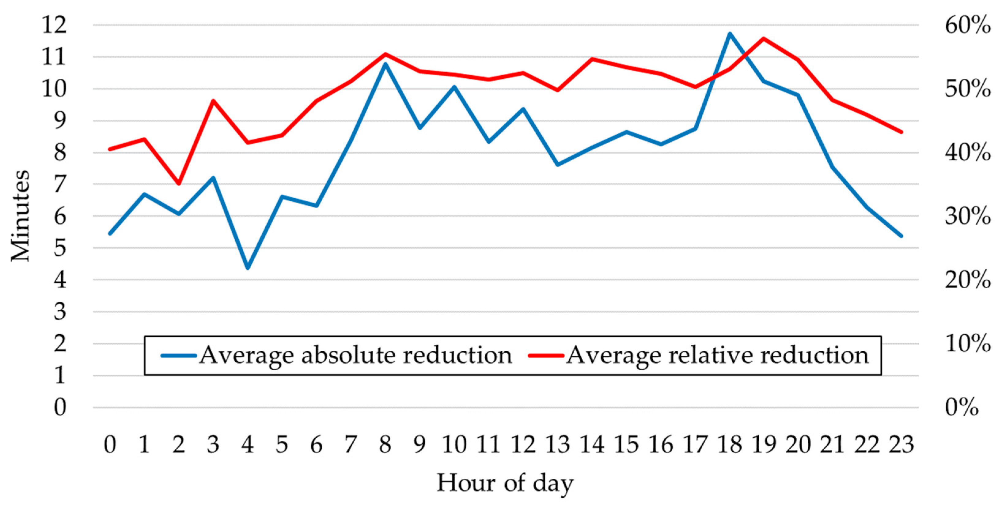 Figure 3 illustrates the average absolute and relative reduction in travel time for healthcare-related deliveries by drones (compared to traditional car transport travel time) across a 24 h period. The blue line represents the average absolute reduction in travel time, which varies from approximately 4.4 min to 11.7 min throughout the day for both drone models. The red line represents the average relative reduction as a percentage of the total travel time, fluctuating between 35% and 58%. The average absolute travel time reductions are most significant in the morning and evening hours, peaking at 11.7 min at 6:00 p.m., with a 53.2% relative reduction. The average relative reduction peaks at 57.9% around 7:00 p.m., where the absolute reduction reaches 10.2 min.